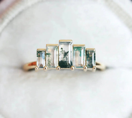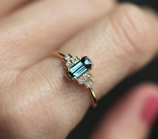Istraži Art Deco baguette prsten ili minimalistički Art Deco dijamantski soliter.