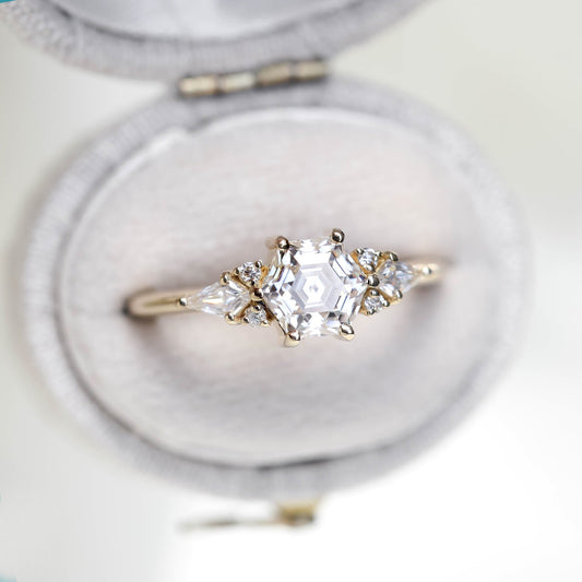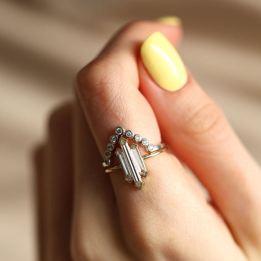 Izdvajamo heksagon rose cut prsten i moderni sivi dijamantski verenički prsten.