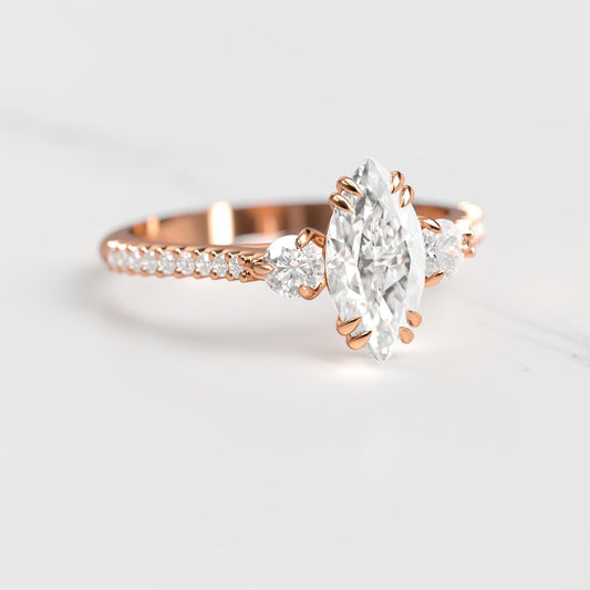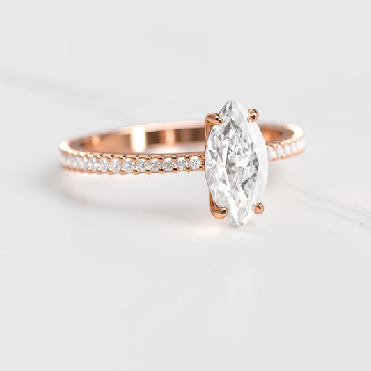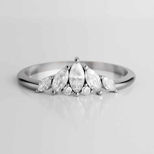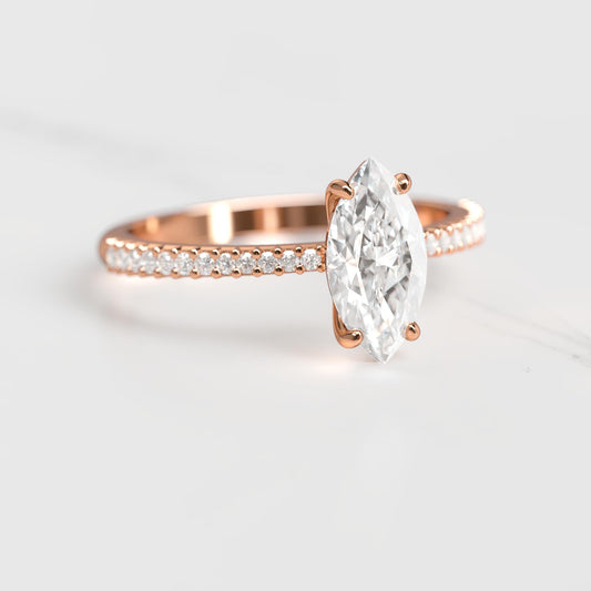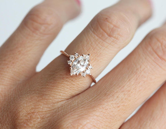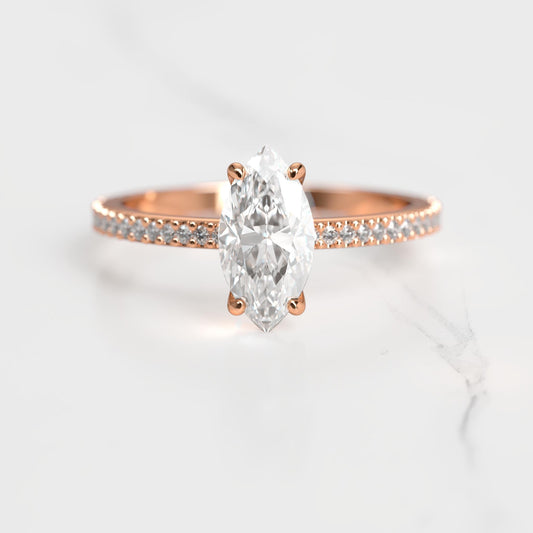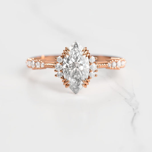 Marquise cut ima eliptičnu formu sa dve oštre tačke, što daje istaknutu dužinu i prepoznatljiv karakter. Ovaj brus maksimalno koristi karatnu masu i nudi dramatičan vizuelni efekat.