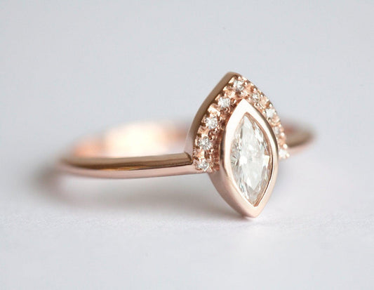 Marquise cut ima eliptičnu formu sa dve oštre tačke, što daje istaknutu dužinu i prepoznatljiv karakter. Ovaj brus maksimalno koristi karatnu masu i nudi dramatičan vizuelni efekat.