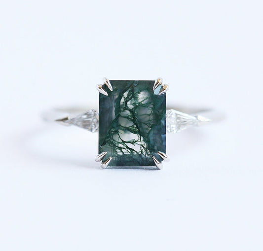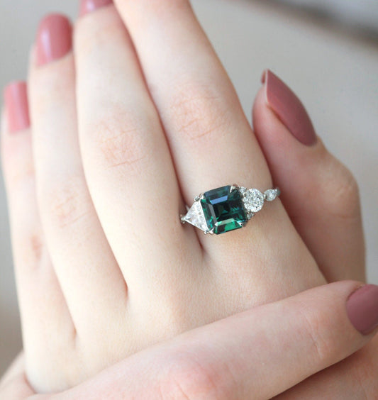 Emerald cut u kvadratnoj silueti spaja arhitektonsku preciznost i mirnu, ogledalsku vatru stepenastog brusa. Ravne fasete naglašavaju bistrinu kamena i eleganciju linije, stvarajući prsten koji odiše sofisticiranošću i bezvremenskim stilom, idealan za ljubitelje čistog dizajna i diskretnog luksuza.