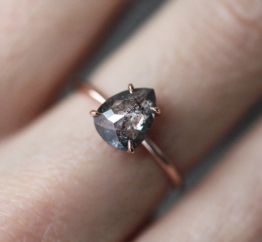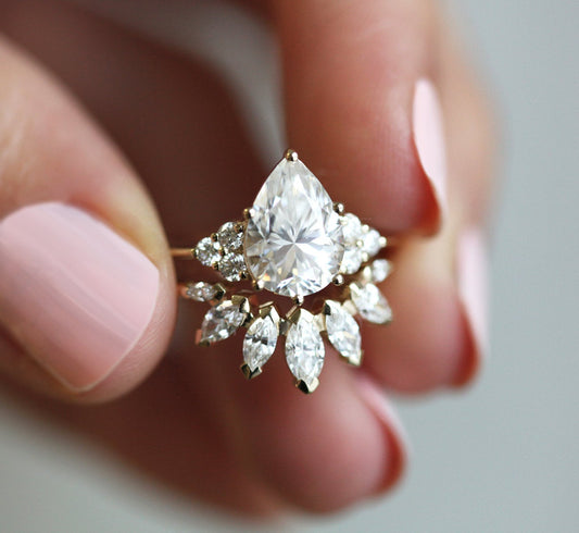 Pear cut spaja okrugli i tačkasti kraj u siluetu suze koja izgleda delikatno i vizuelno produžuje prst. Položena ka spolja ili ka unutra, ova forma menja balans i karakter celog dizajna.