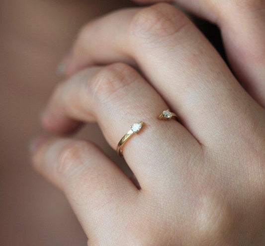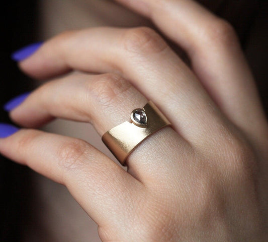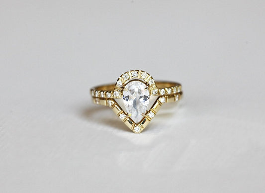 Pear cut spaja okrugli i tačkasti kraj u siluetu suze koja izgleda delikatno i vizuelno produžuje prst. Položena ka spolja ili ka unutra, ova forma menja balans i karakter celog dizajna.