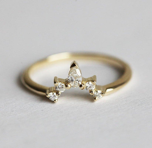 Pear cut spaja okrugli i tačkasti kraj u siluetu suze koja izgleda delikatno i vizuelno produžuje prst. Položena ka spolja ili ka unutra, ova forma menja balans i karakter celog dizajna.