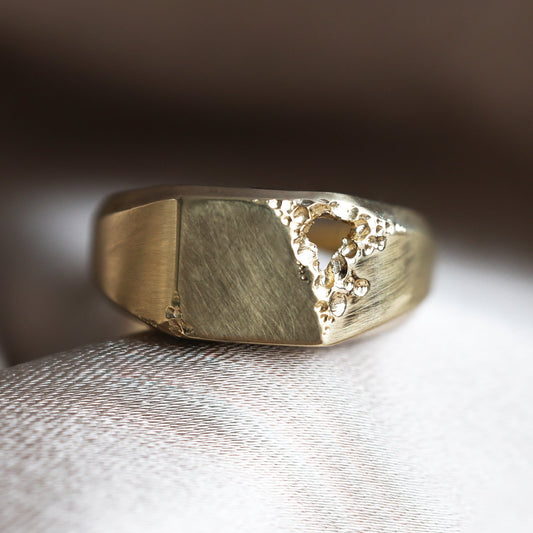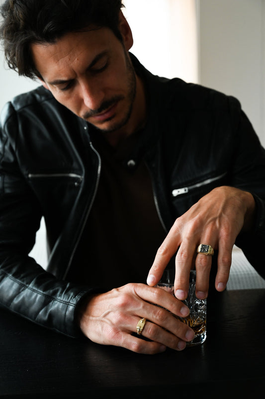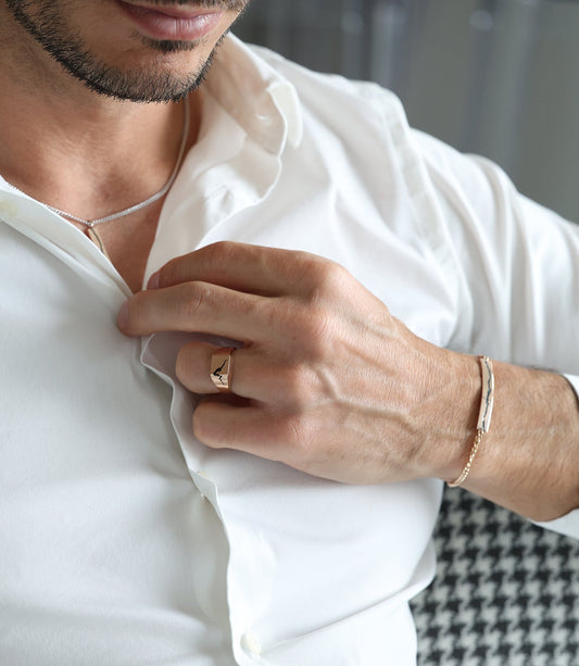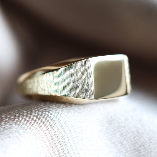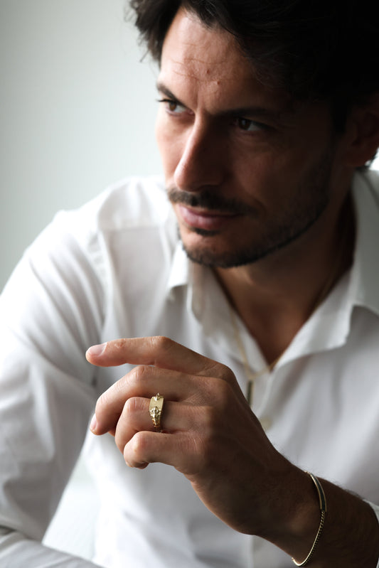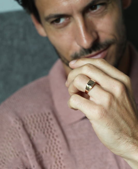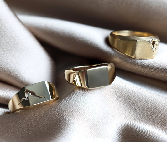 Pečatno prstenje odaje utisak snage i tradicije uz prepoznatljivu ravnu ploču i čiste ivice. Izdvajamo prsten sa reljefnim detaljima i široku zlatnu burmu.