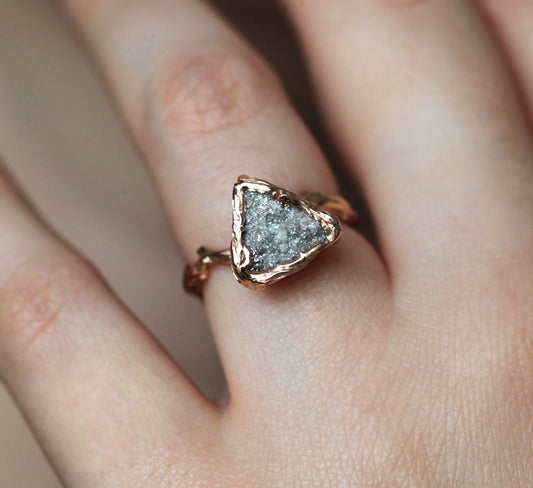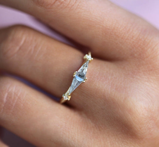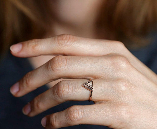 Izdvajamo upečatljiv trouglasti dijamantski prsten i delikatniji trillion u roze zlatu.