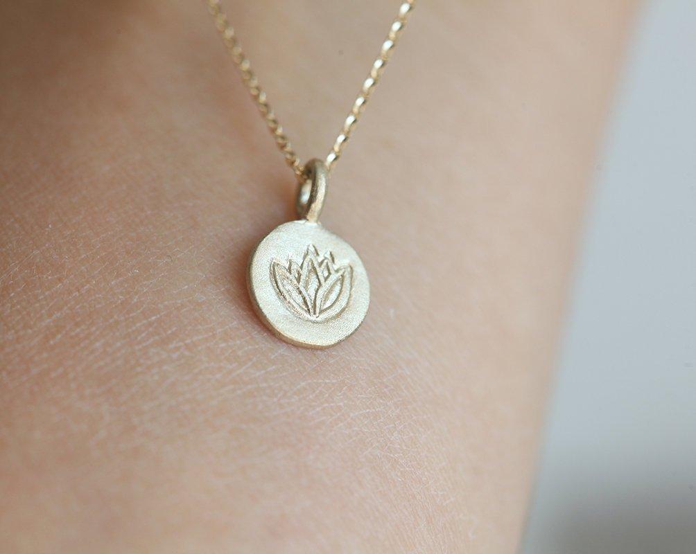 Jednostavna ogrlica sa lotus diskom i Ohm priveskom. Nežna ogrlica sa joga šarmom u 14k ili 18k punom zlatu iz Capucinne kolekcije. Savršen poklon za ljubitelje zen filozofije ili budizma.