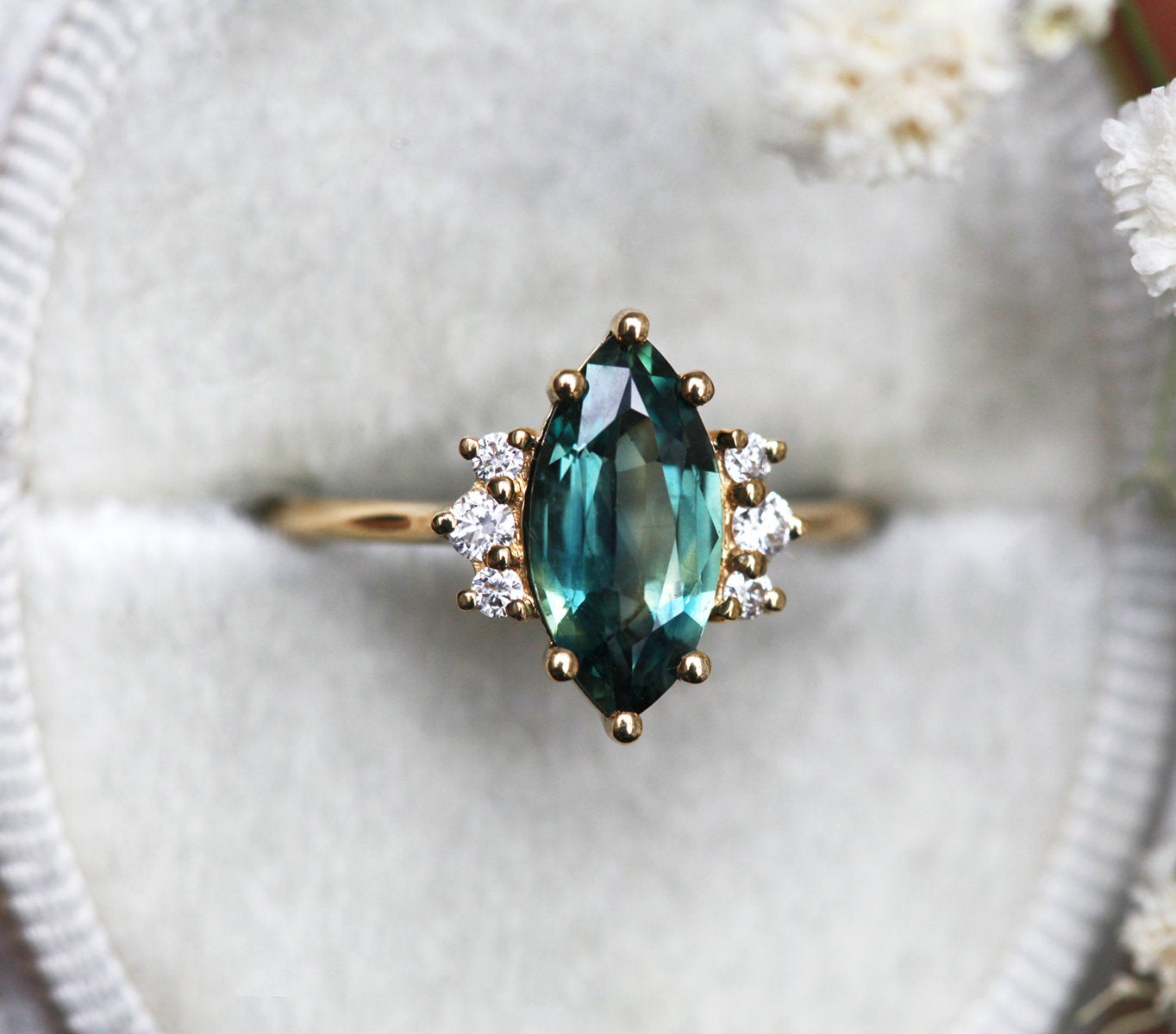 Morena, izuzetno delo dizajnirano da istakne lepotu dame. Sa marquise-sečenim teal safirom naglašenim okruglim dijamantima sa strane, ovaj dizajn će vaš poseban dan učiniti nezaboravnim.