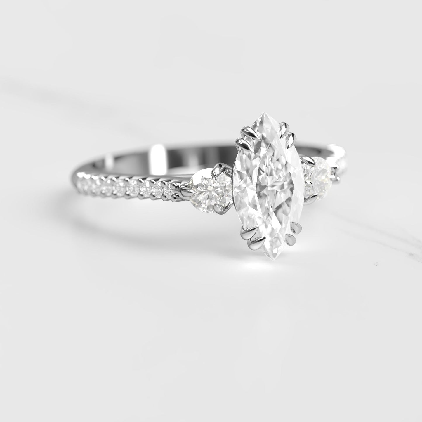 Polu pave postavka sa marquise dijamantom i bočnim dijamantima koja naglašava sjaj centralnog kamena.