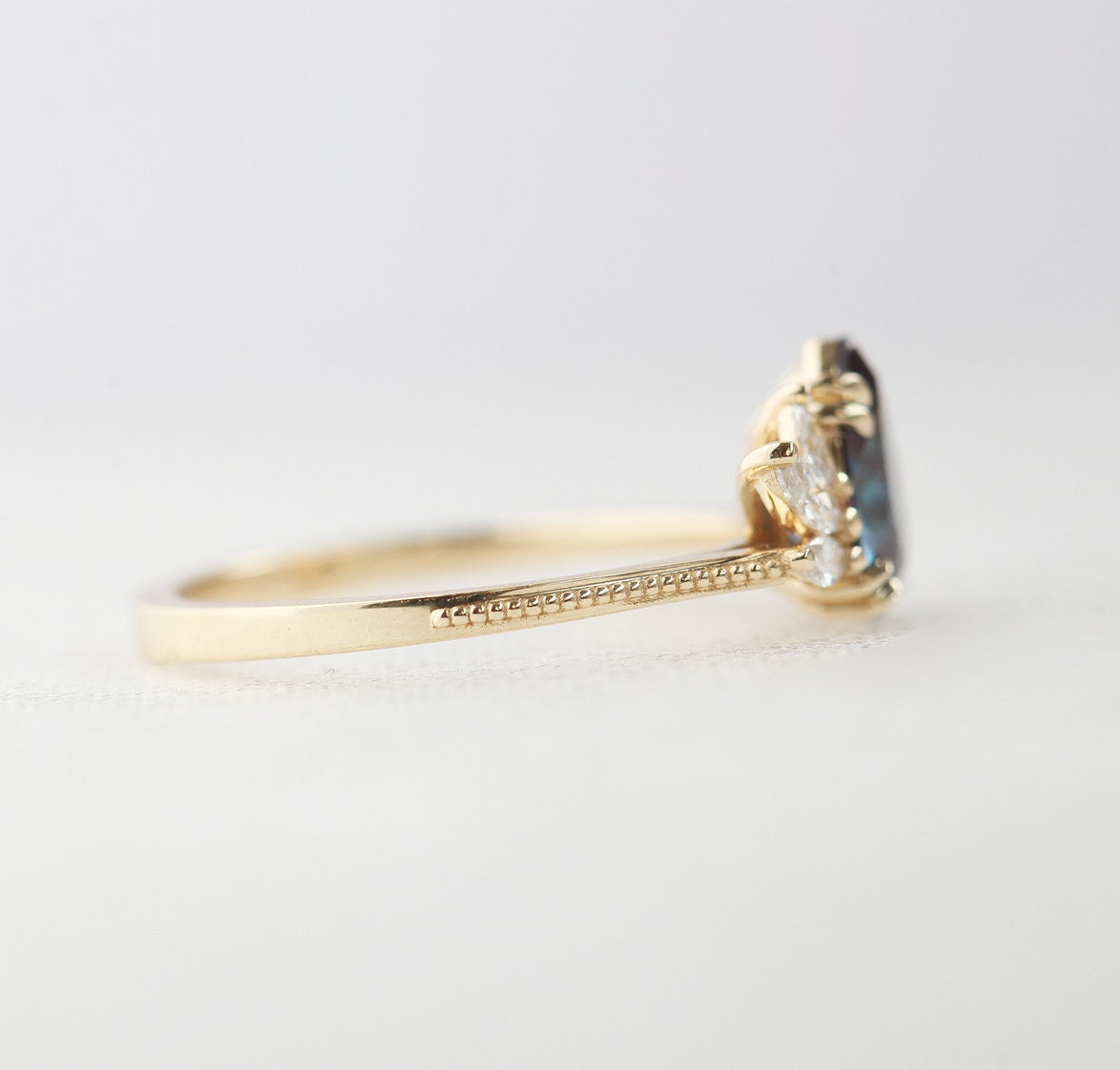 Naš Teresa prsten je očaravajući izbor za vanvremensku eleganciju. Bočni dijamanti naglašavaju teal pear lab alexandrite na sofisticiran način. Savršen je kao jedinstveni verenički prsten ili burma.
