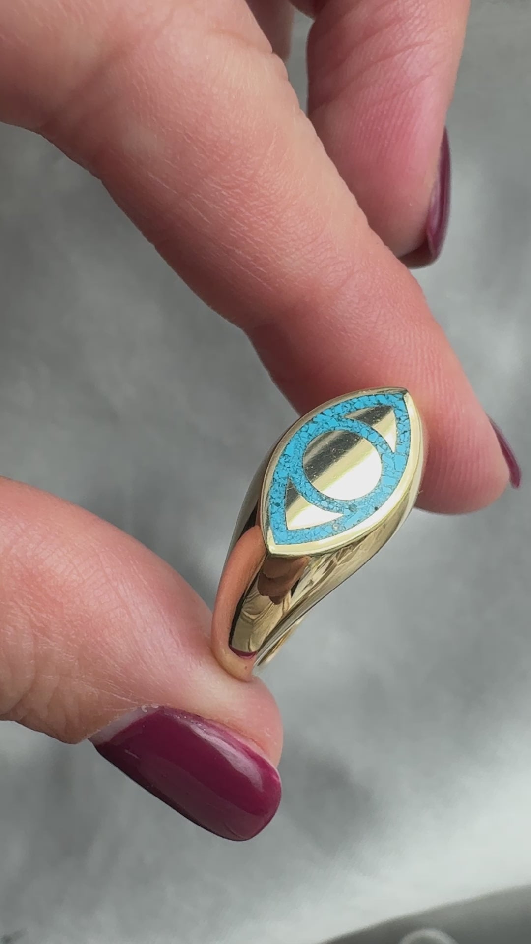Ovaj elegantan dizajn je uniseks pečatni prsten od zlata ili platine sa inlay od prirodnog tirkiza.