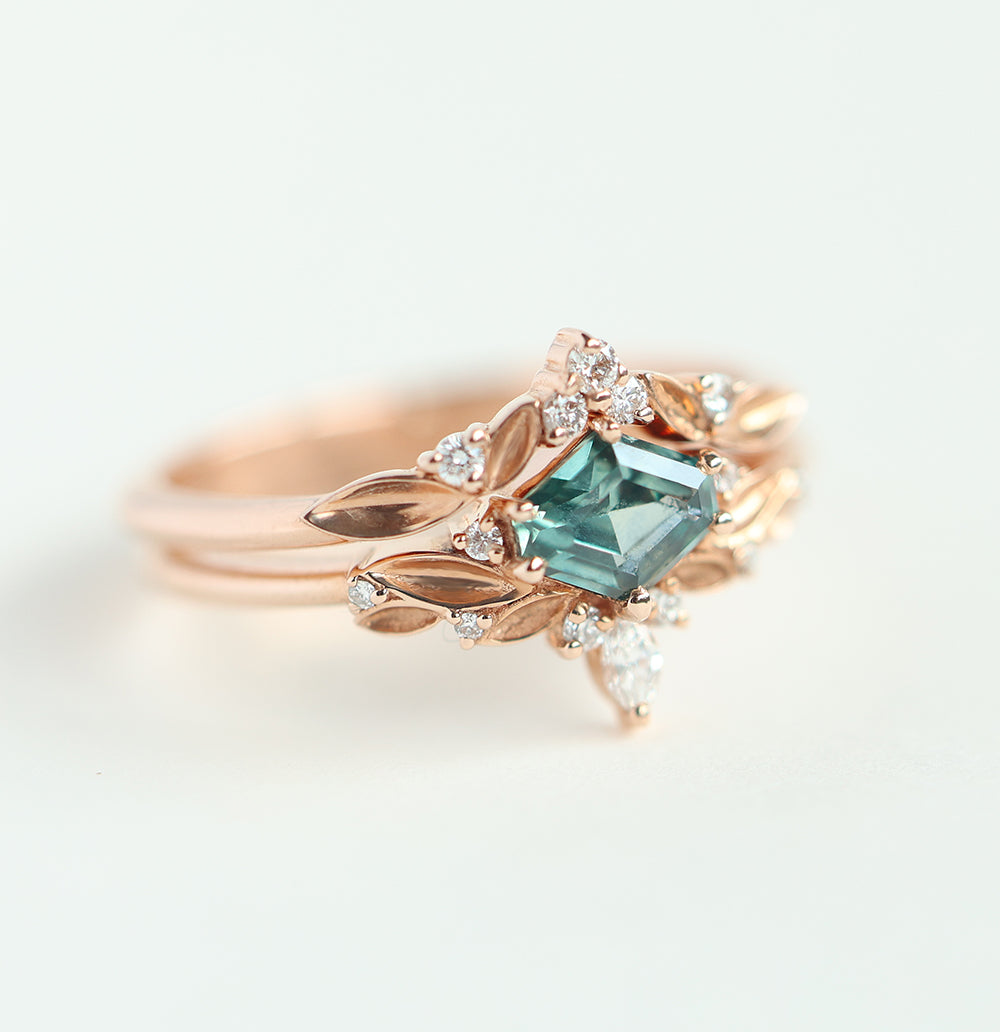 Armony prsten u obliku heksagona sa Montana safirom i dijamantom u obliku lista, odiše nežnom elegancijom i simbolikom prirode. Možete izabrati samo safirni prsten ili ceo set iz padajućeg menija.
