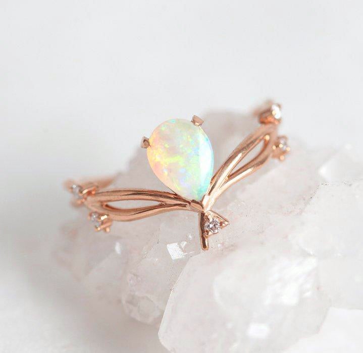 Naš jedinstveni Arizona prsten prikazuje pear australijski opal kao centralni kamen ukrašen dijamantima postavljenim u detalj grane. Nežan dizajn ovog prstena podići će eleganciju svake ruke.