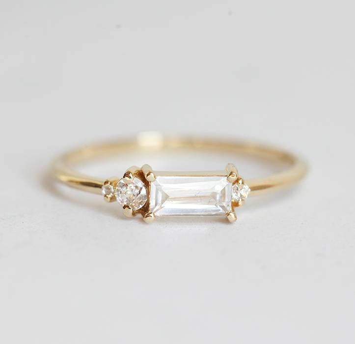 Prelep prsten sa belim safirom u baguette obliku i dijamantima.