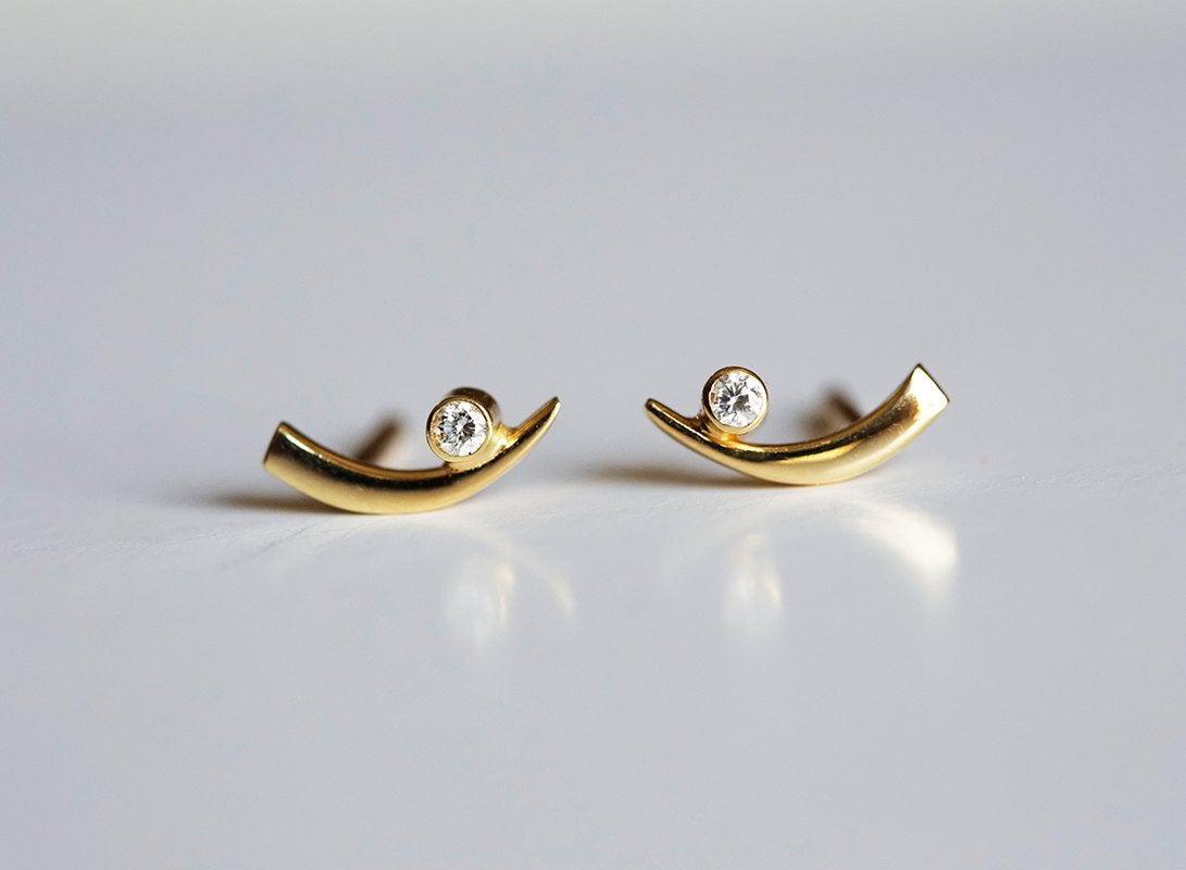 Par jedinstvenih minimalističkih minđuša na šraf sa belim dijamantima postavljenim u 14k punom roze, belom ili žutom zlatu. Posebne i nežne zakrivljene minđuše idealne su kao iznenađenje za voljenu osobu.
