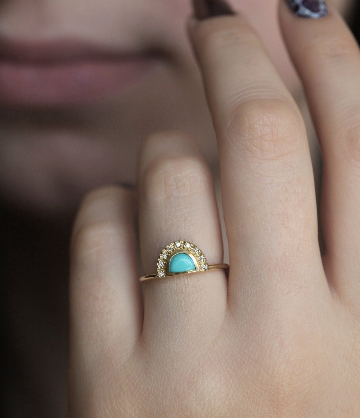 Ovaj prelepi boho prsten prikazuje turkiz u obliku polumeseca sa bočnim dijamantima u nežnom i sofisticiranom dizajnu. Može se nositi samostalno ili u paru sa uklapajućim prstenom za dodatnu eleganciju i šarm. SPREMAN ZA SLANJE u 18k žutom zlatu, US 5 3/4 (može se prilagoditi).