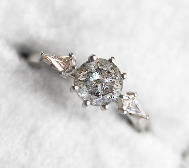 Prsten sa "salt and pepper" dijamantom od jednog karata i bočnim belim dijamantima u obliku romba. Elegantna i jednostavna kombinacija idealna za vaš poseban dan.