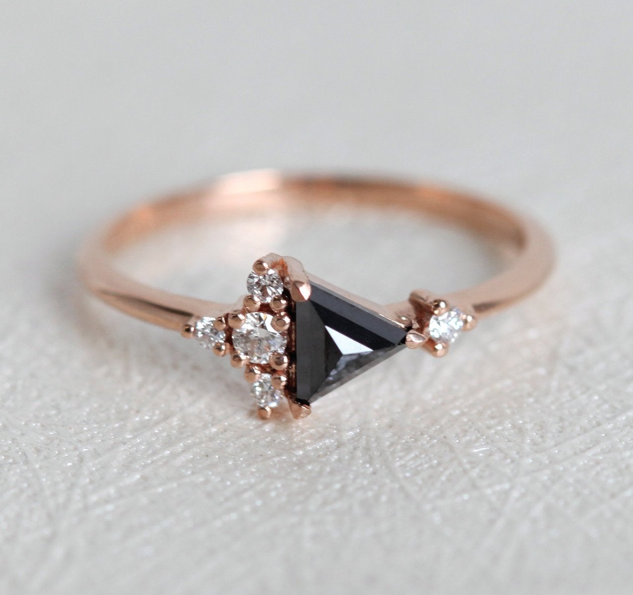 Luksuzan prsten sa trilijum crnim dijamantom i bočnim belim dijamantima. Elegantna kombinacija kontrasta i sofisticiranog sjaja čini ga savršenim za posebne trenutke.