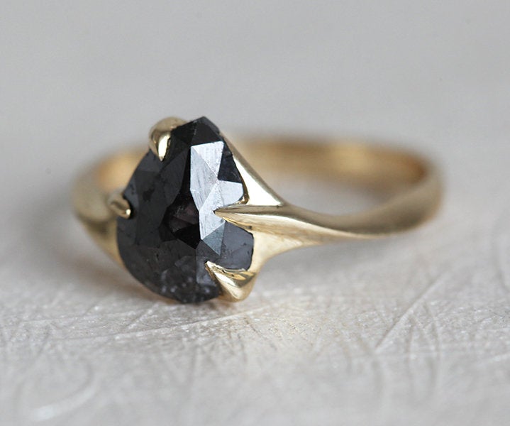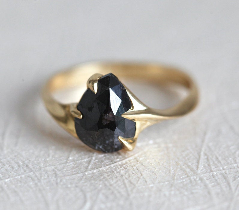Jedinstveni prsten sa crnim dijamantom u Emerald cut obliku u prong postavci – luksuzni poklon za posebnu priliku. Ručno izrađen, od prirodnih neobrađenih crnih dijamanata koji mogu sadržati prirodne inkluzije. Po želji možemo obezbediti i obrađene dijamante. Spreman za slanje u 18k žutom zlatu, US veličina 5 3/4.