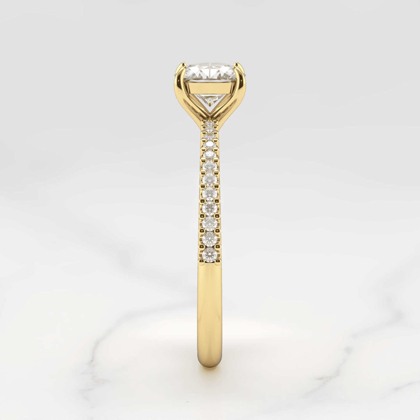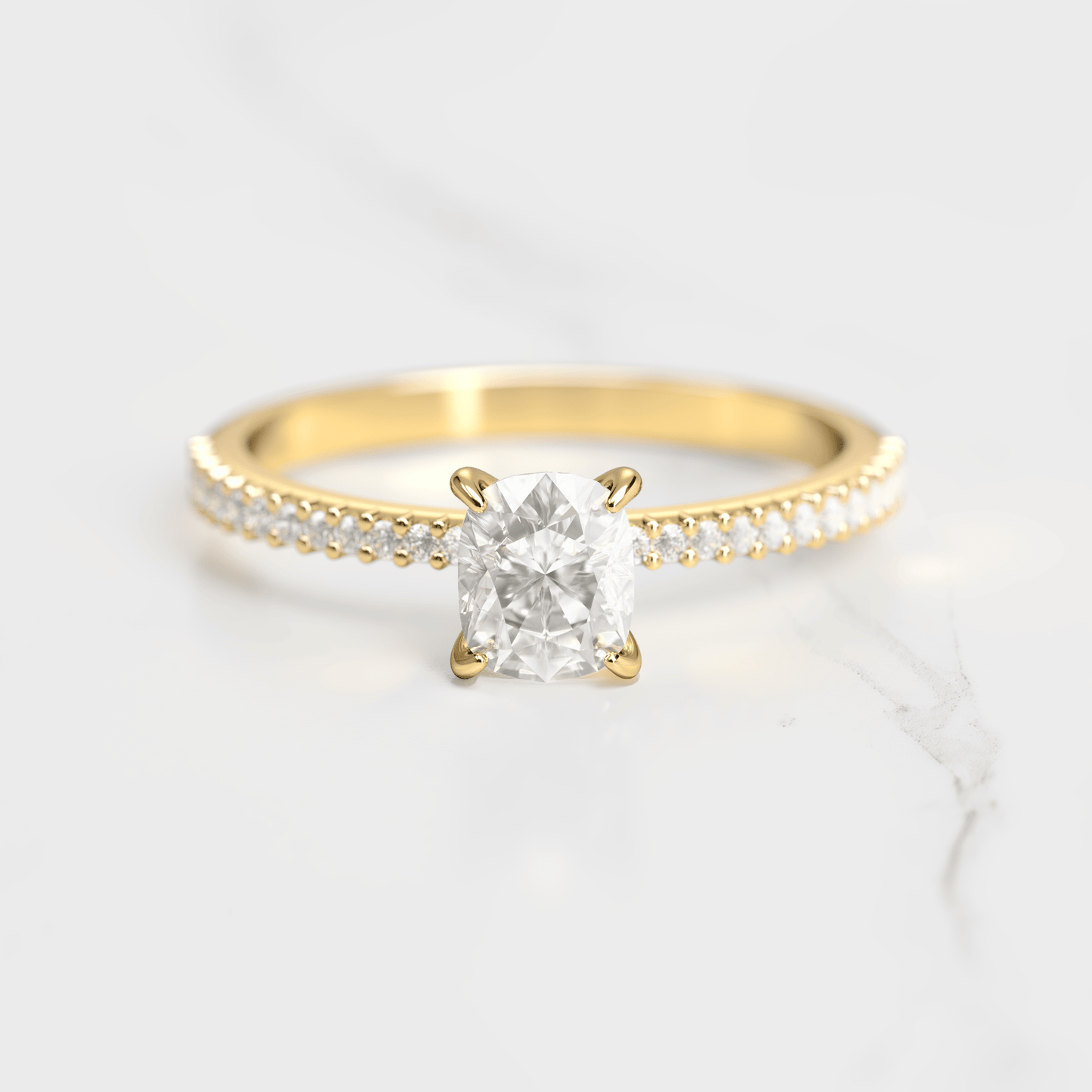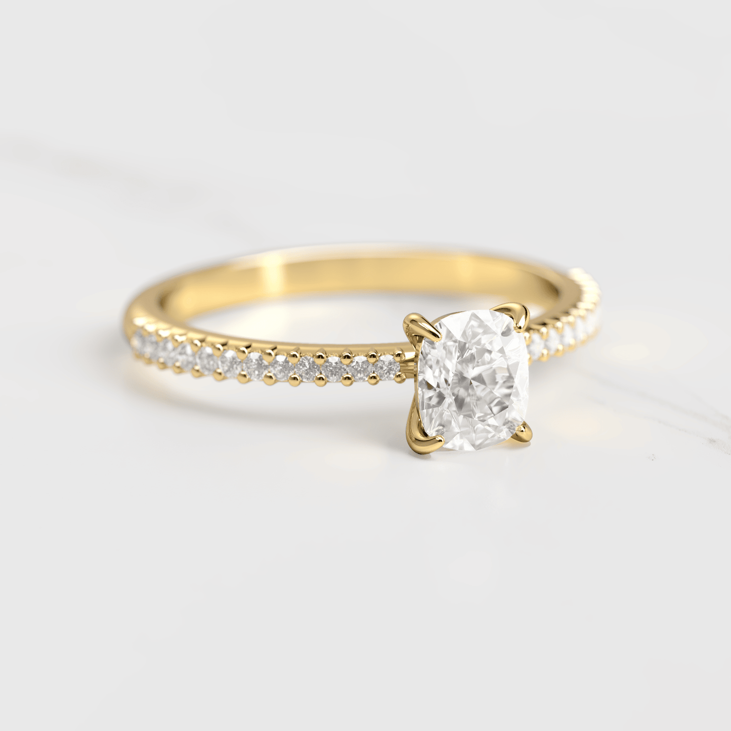 Luksuzni prsten za veridbu sa dijamantom Cushion, izrađen sa half pave suženim prstenom koji pruža kontinuiranu briljantnost bez skretanja pažnje sa centralnog kamena.