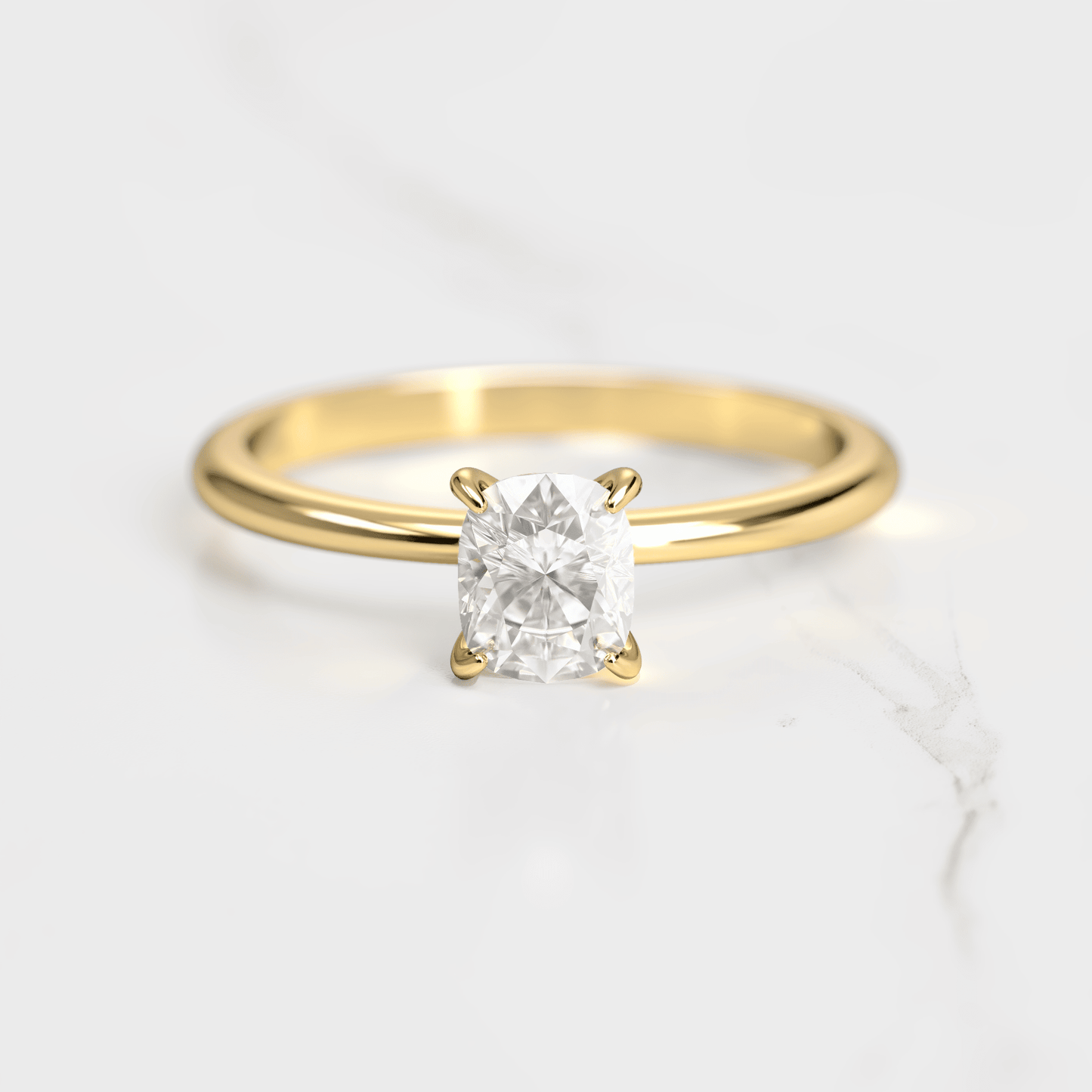 vanvremenski solitaire prsten sa dijamantom Cushion, minimalističkog dizajna koji se lako kombinuje sa venčanim prstenovima i prilagođava različitim stilovima.