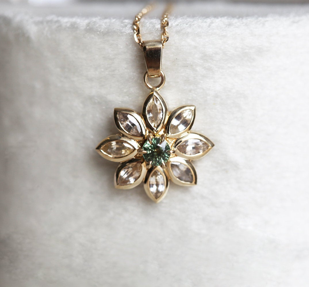 Ova ogrlica je detaljno cvetno remek-delo. Teal safir je uokviren laticama marquise-oblika od belog safira, donoseći delikatnu kombinaciju boja koja će graciozno upotpuniti vrat svake dame. To je savršena ideja za poklon za svaku posebnu ženu u vašem životu.