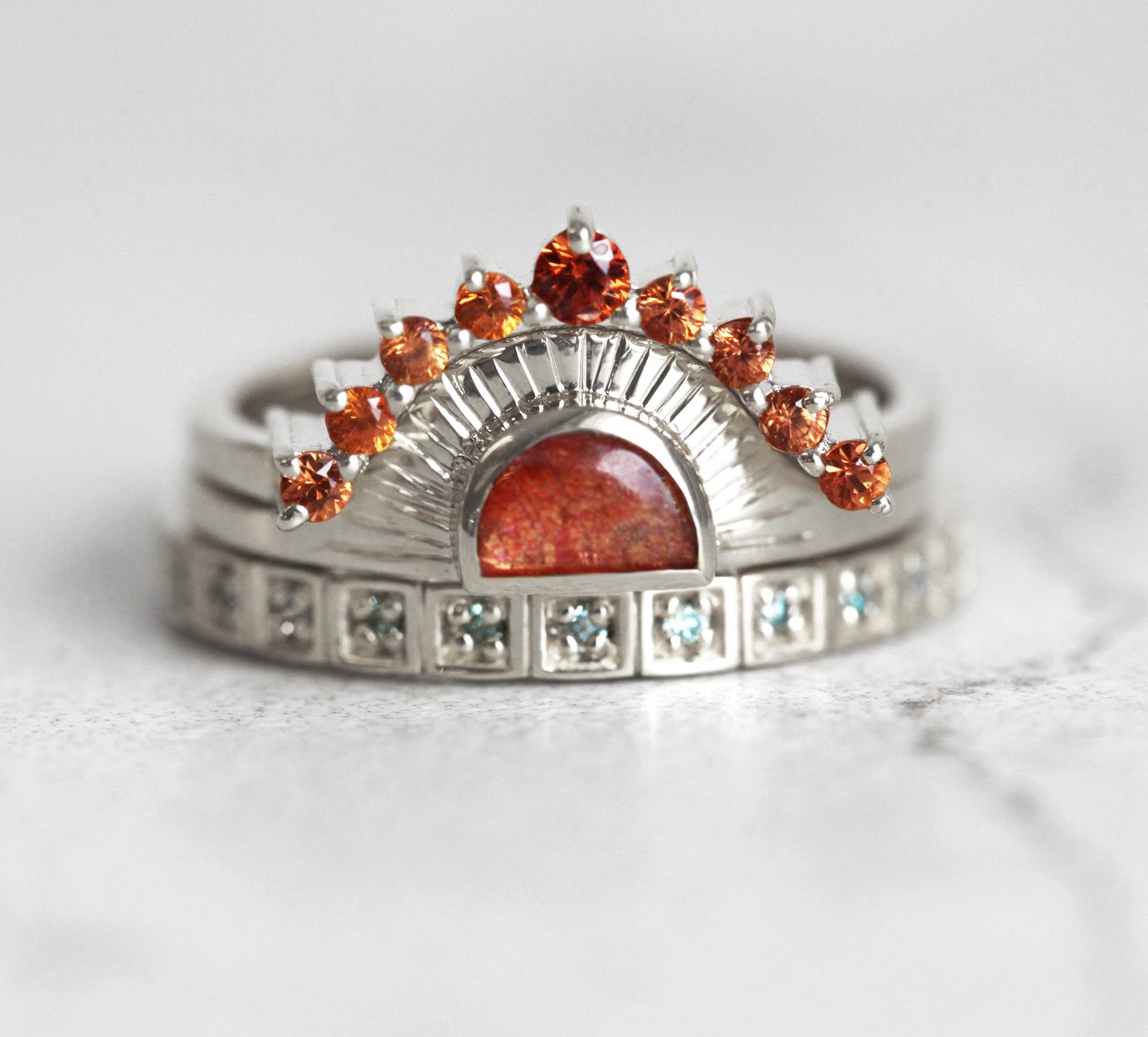 Prsten inspirisan boho stilom, sa sunčevim kamenom u obliku polumeseca. Cena se odnosi samo na glavni prsten.