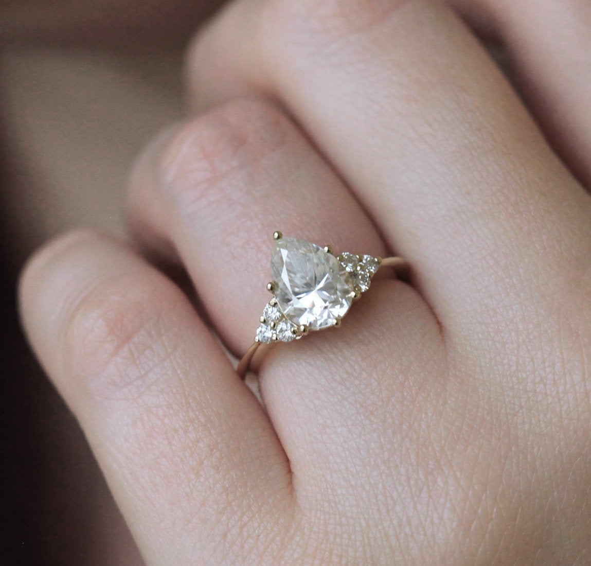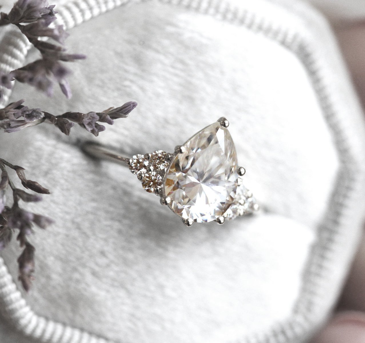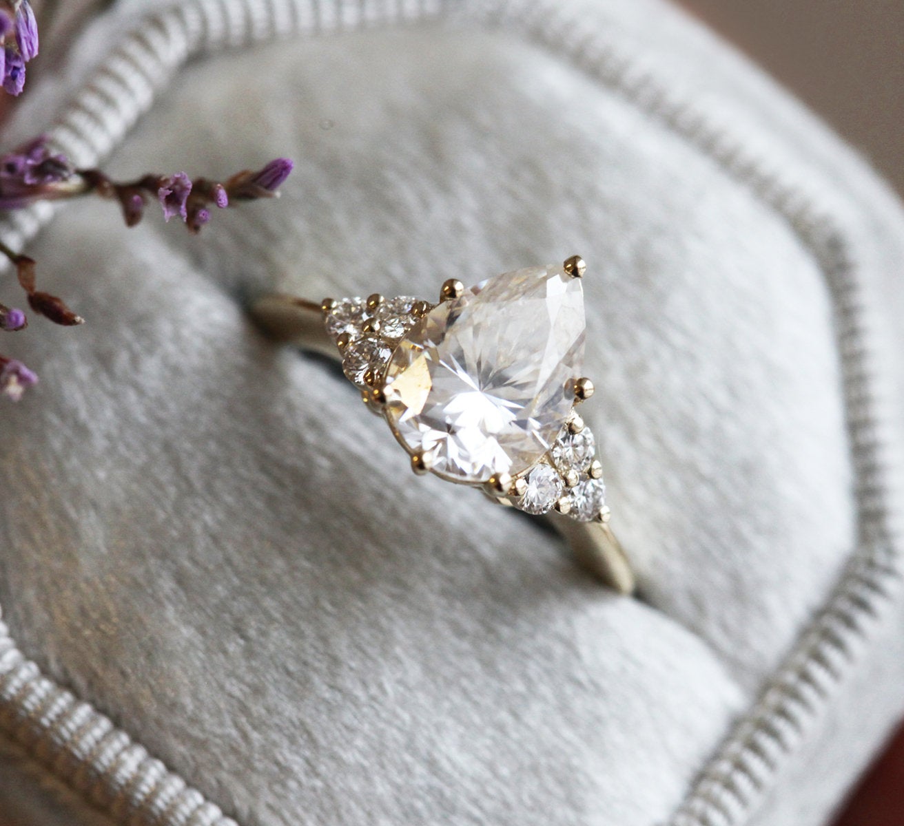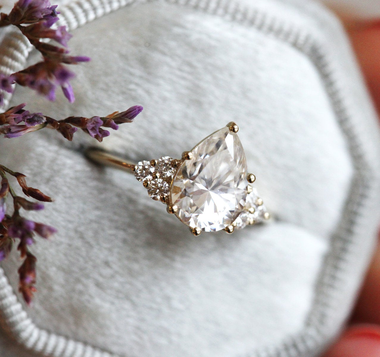 Jeanie je stvoren za žene koje vole tradicionalni dizajn. Pear kamen kao centralni, uparen sa klaster dijamantima, blista snagom i elegancijom. Bez obzira da li izaberete moissanite ili dijamant, veridba će izgledati raskošno i nezaboravno.