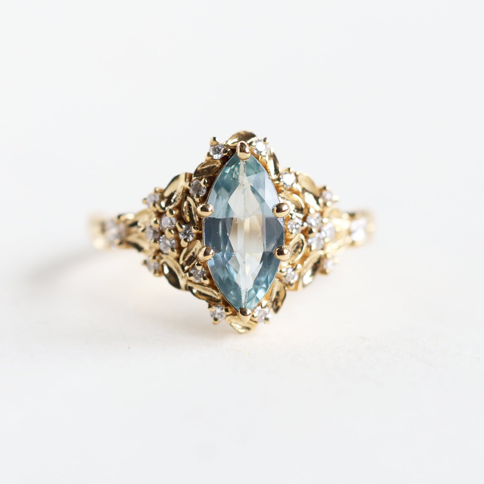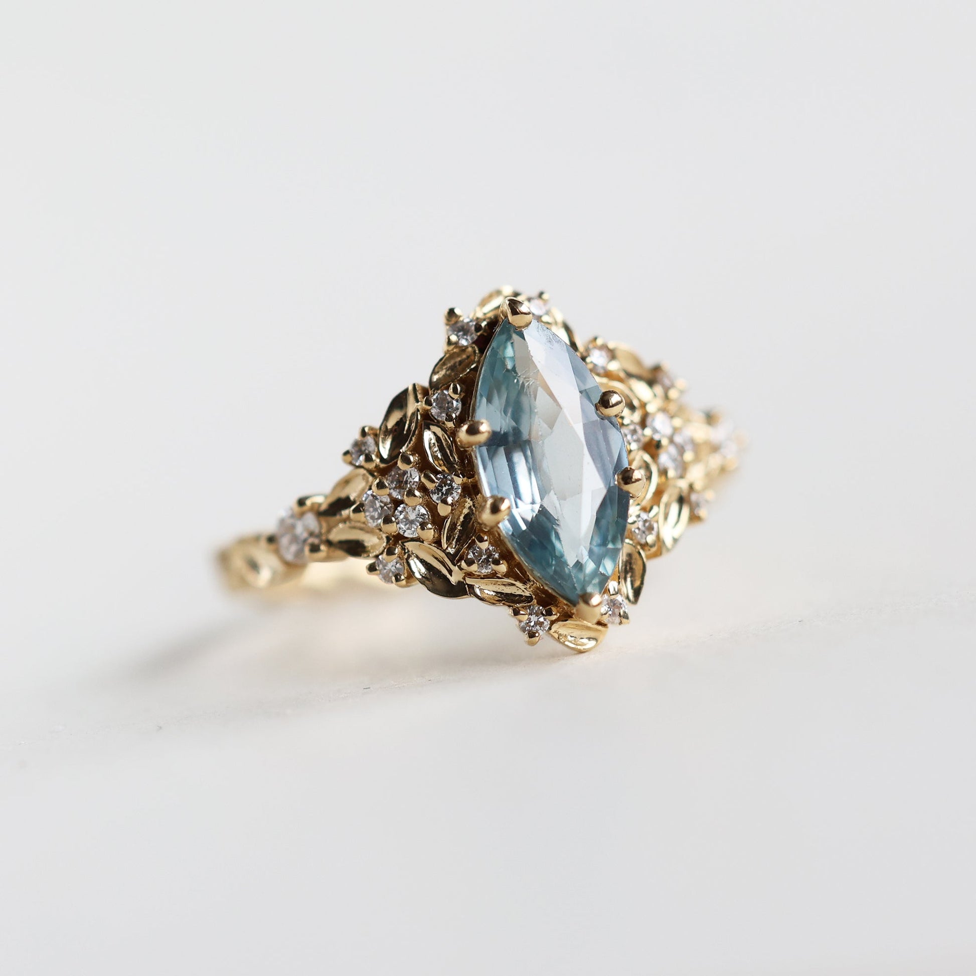 Elara marquise aqua safirni prsten sa detaljima lista i dijamantskim kamenjem - Spreman za isporuku