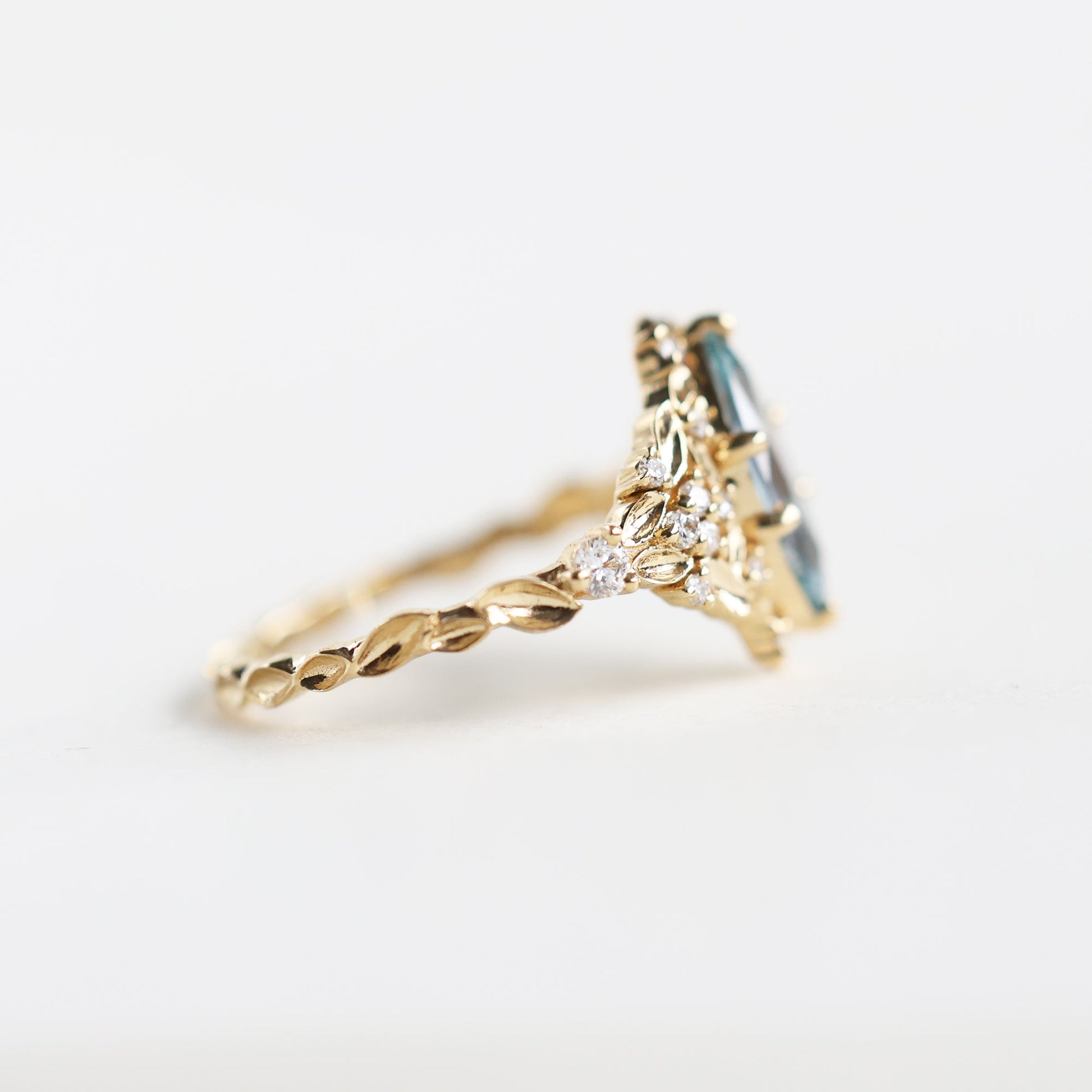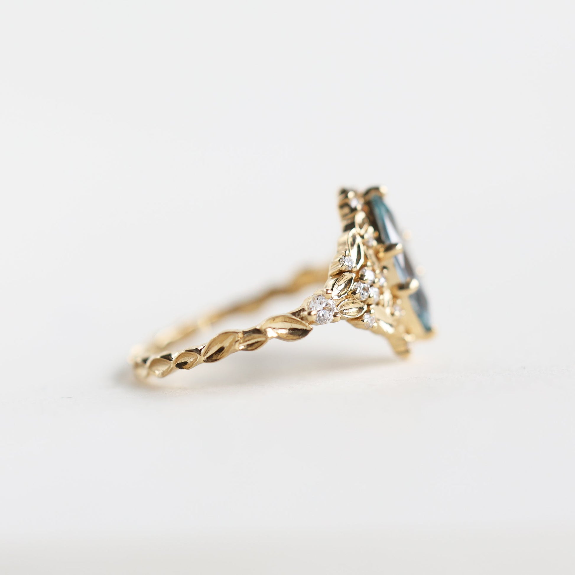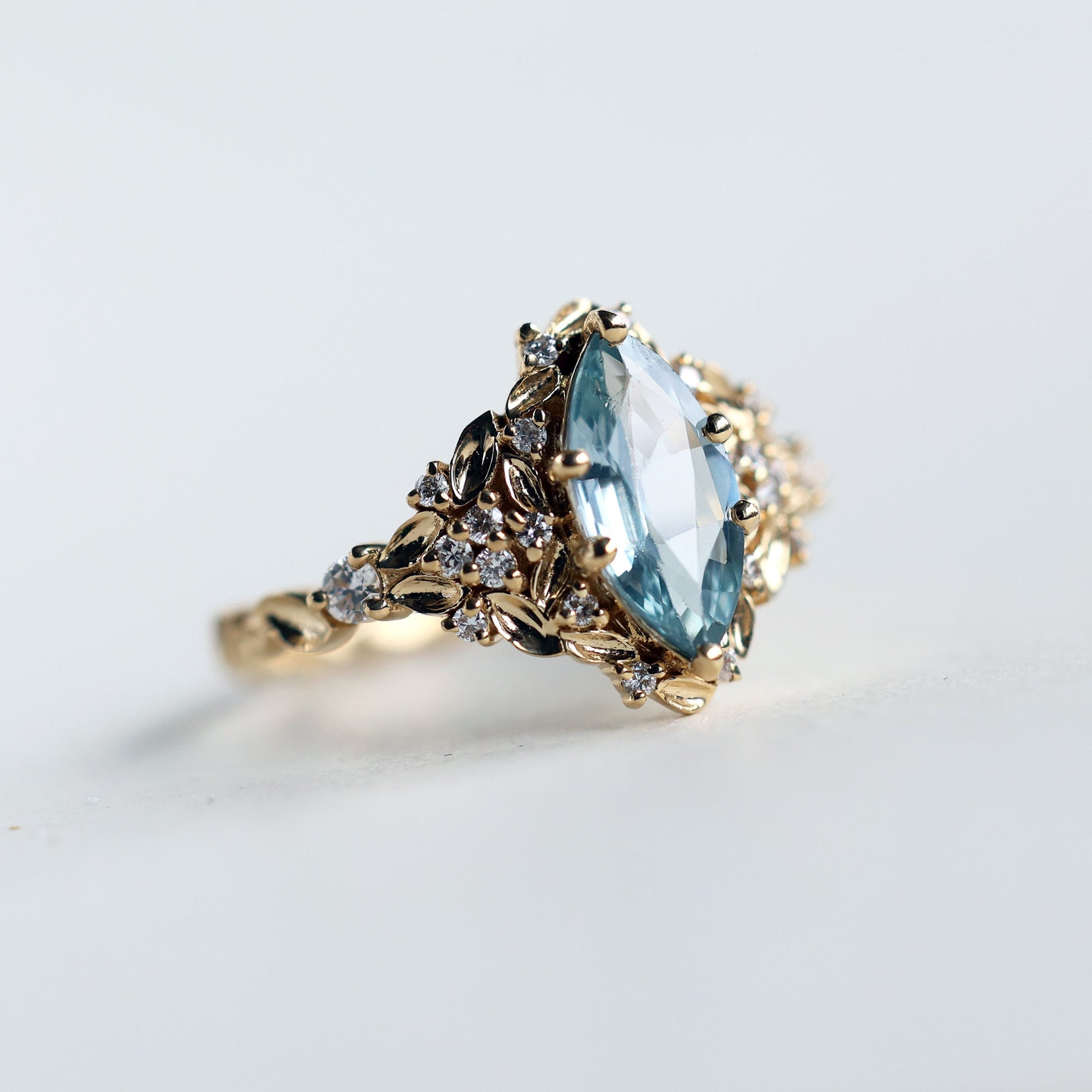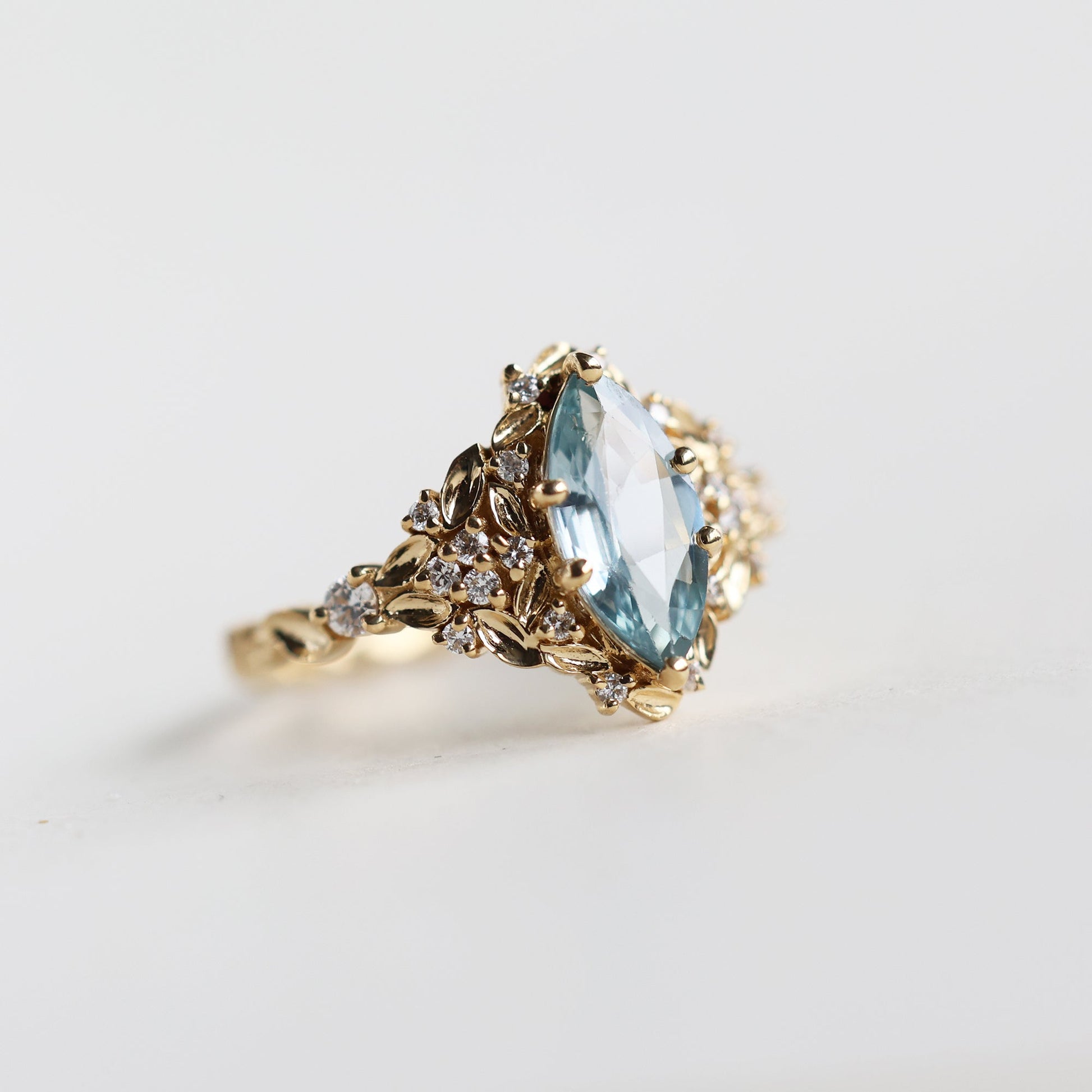 Jedinstveni prsten za veridbu sa marquise aqua safirom od 1ct i bočnim dijamantima u obliku lišća.