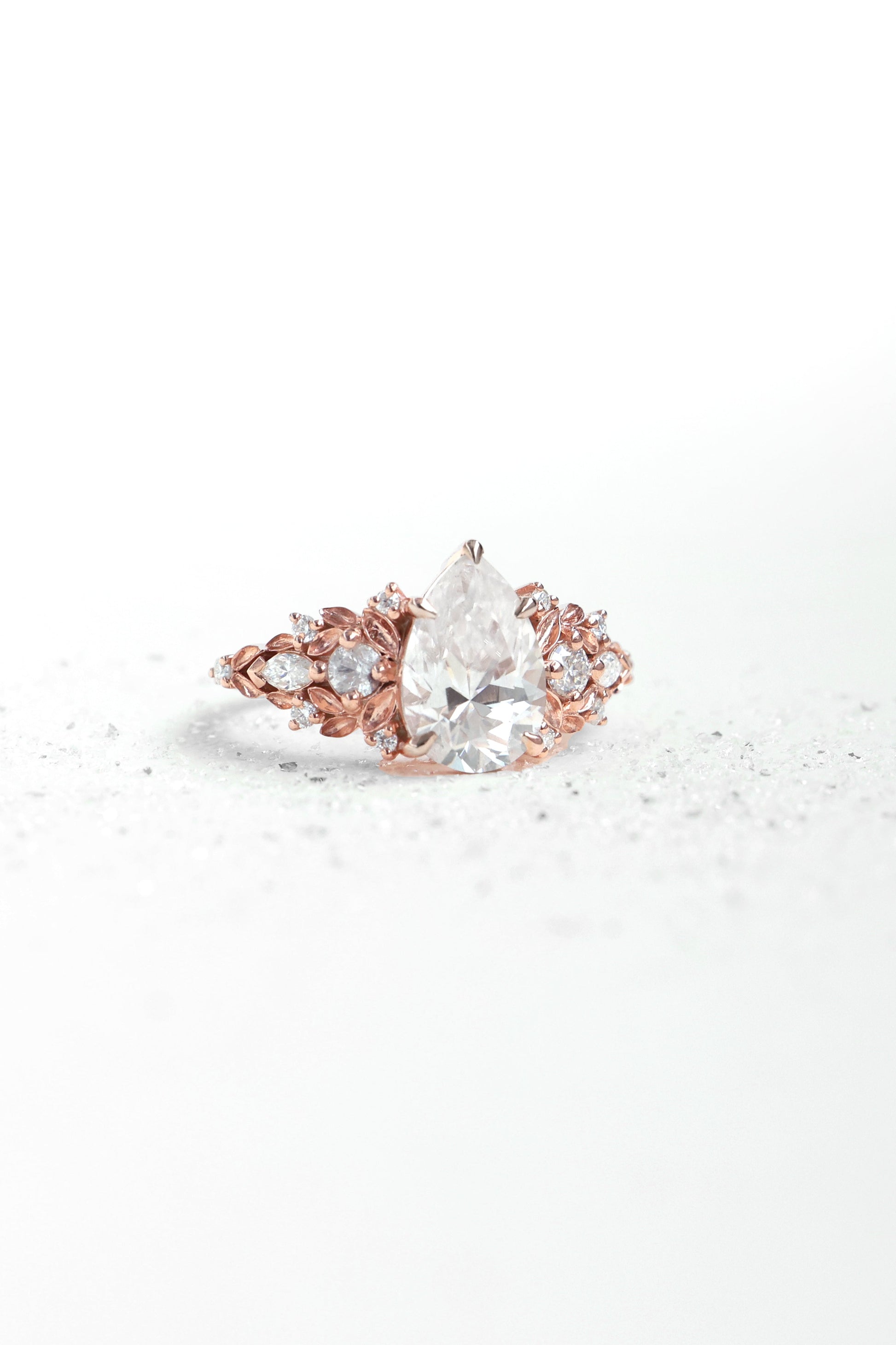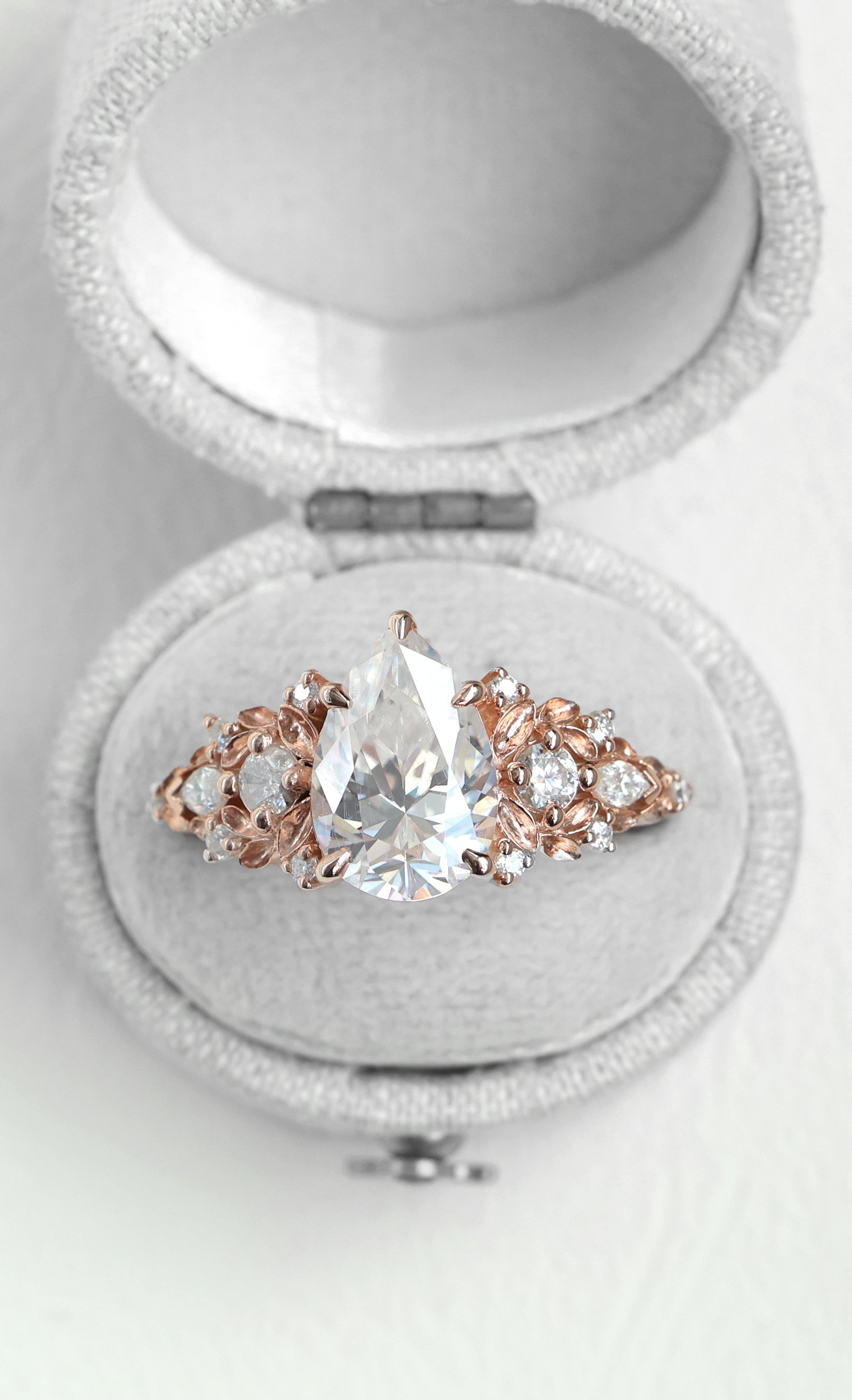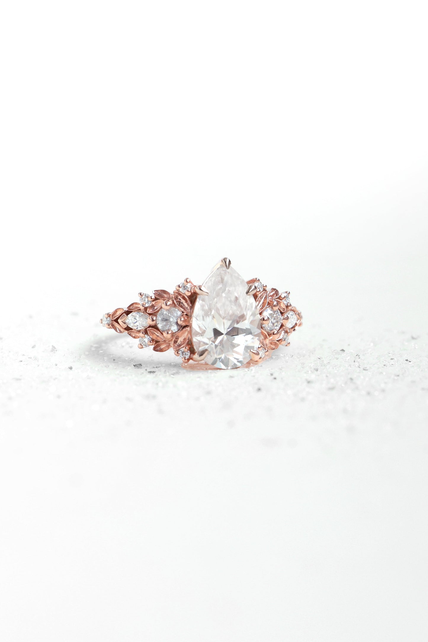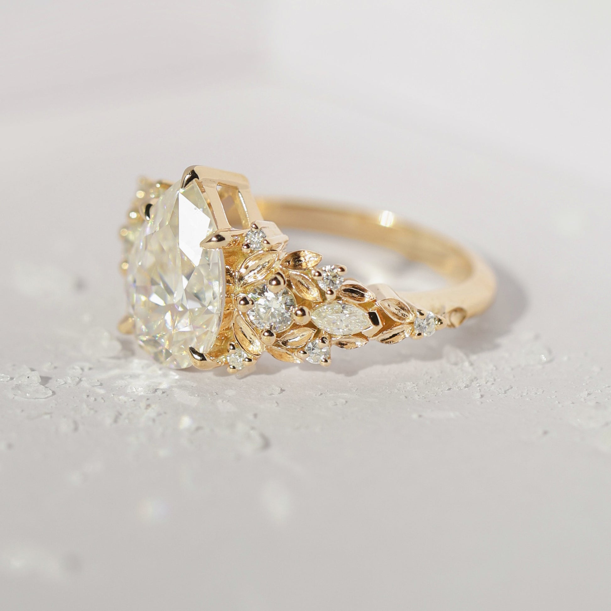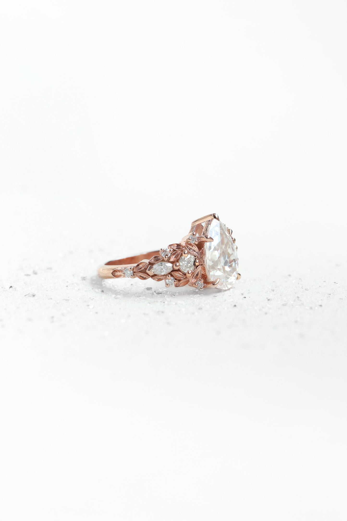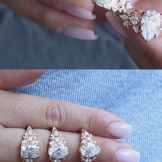 Jedinstveni verenički prsten sa safirom sa približno 3 ct pear laboratorijski uzgojenim dijamantom, uokviren nežnim detaljima nadahnutim listovima i bočnim dijamantima.