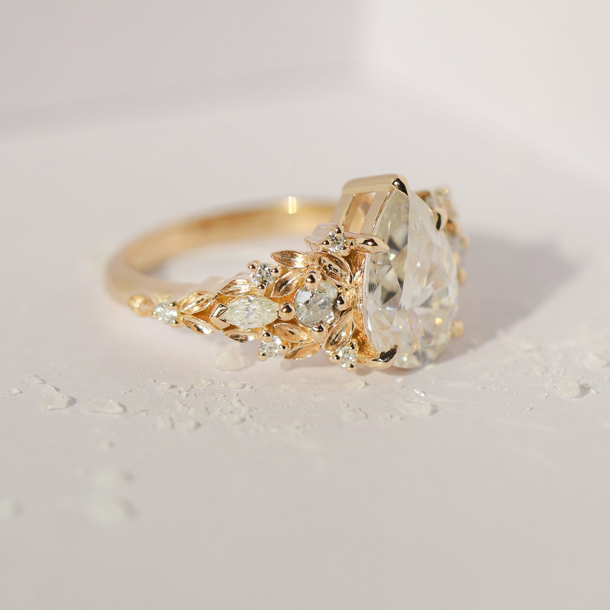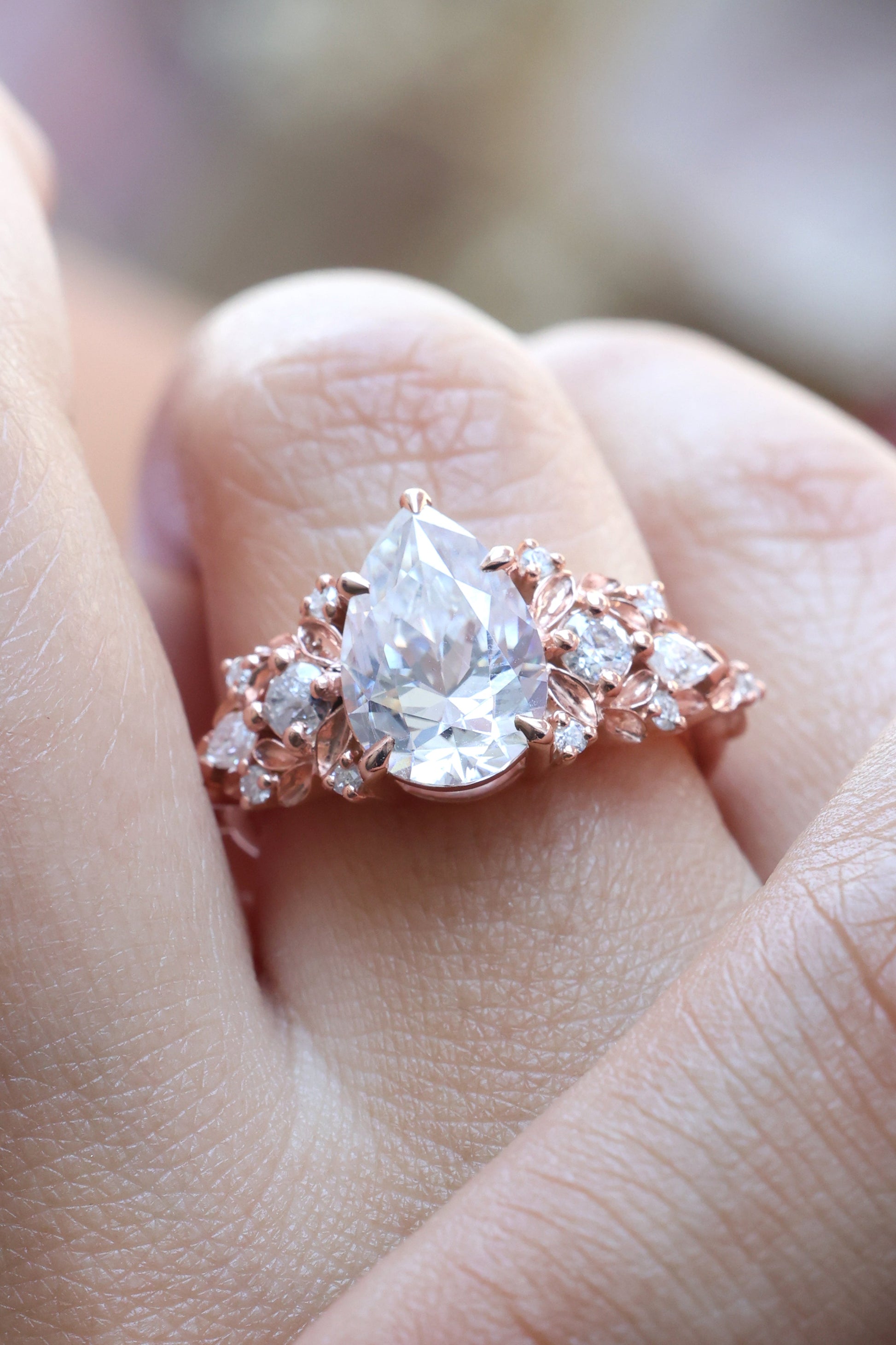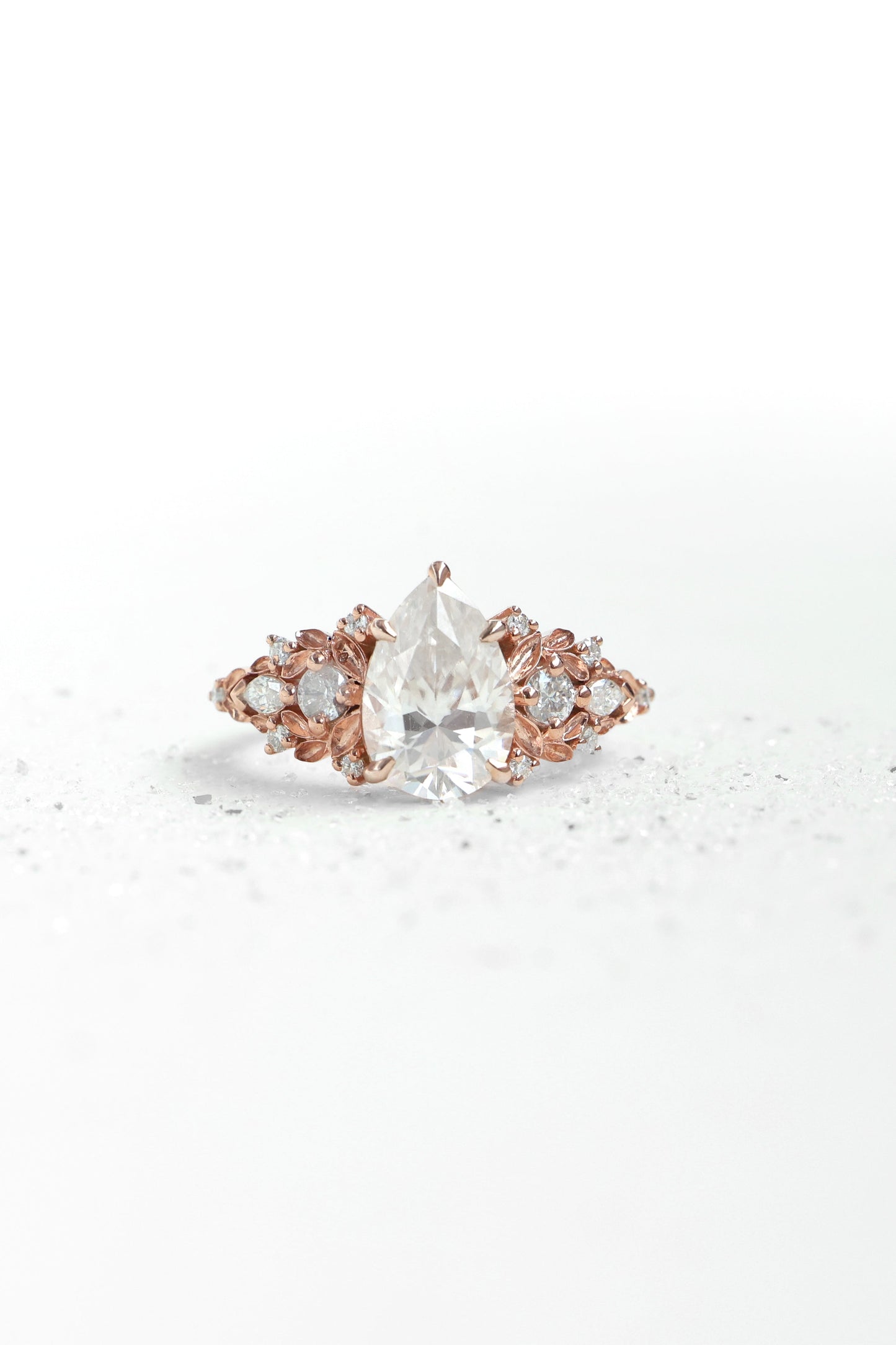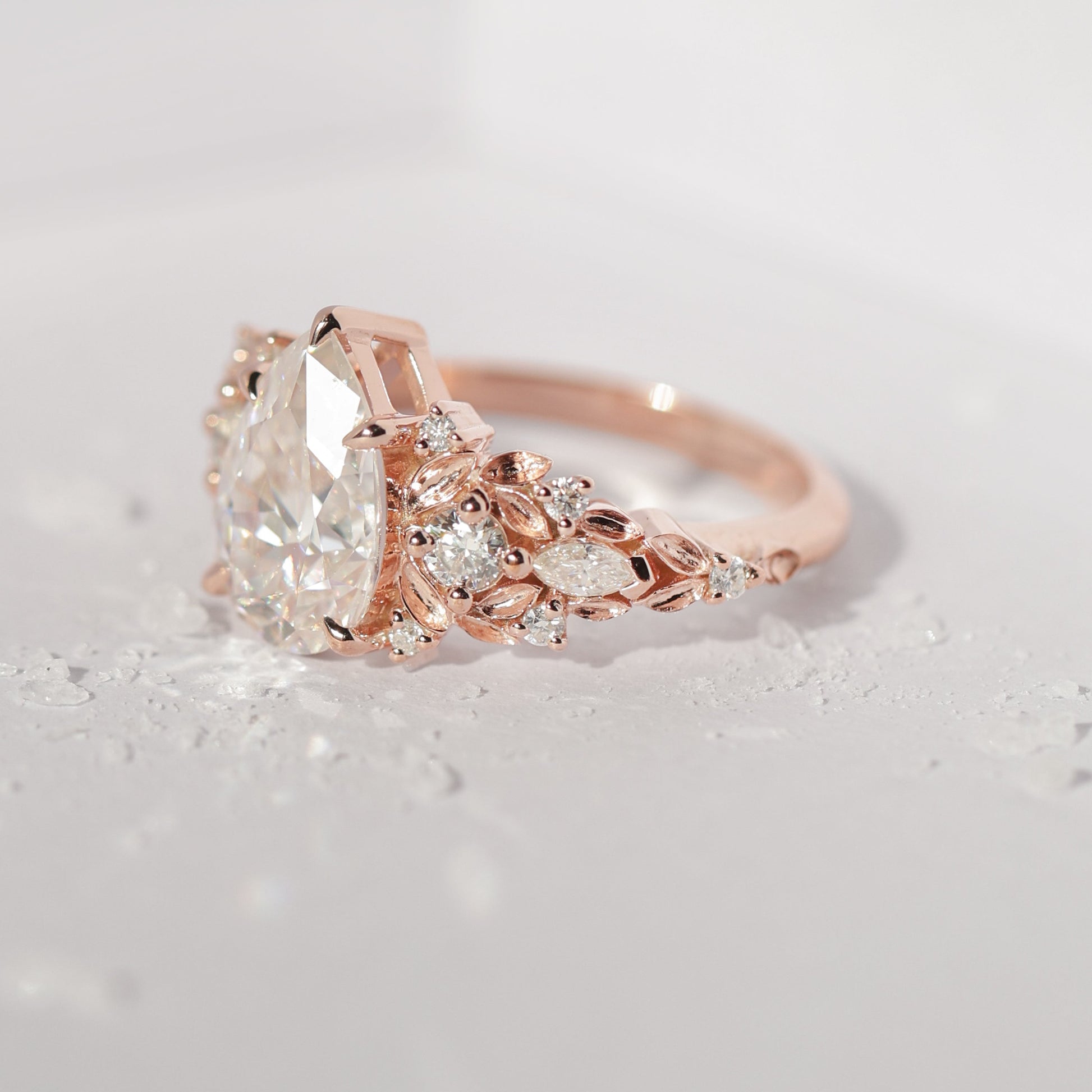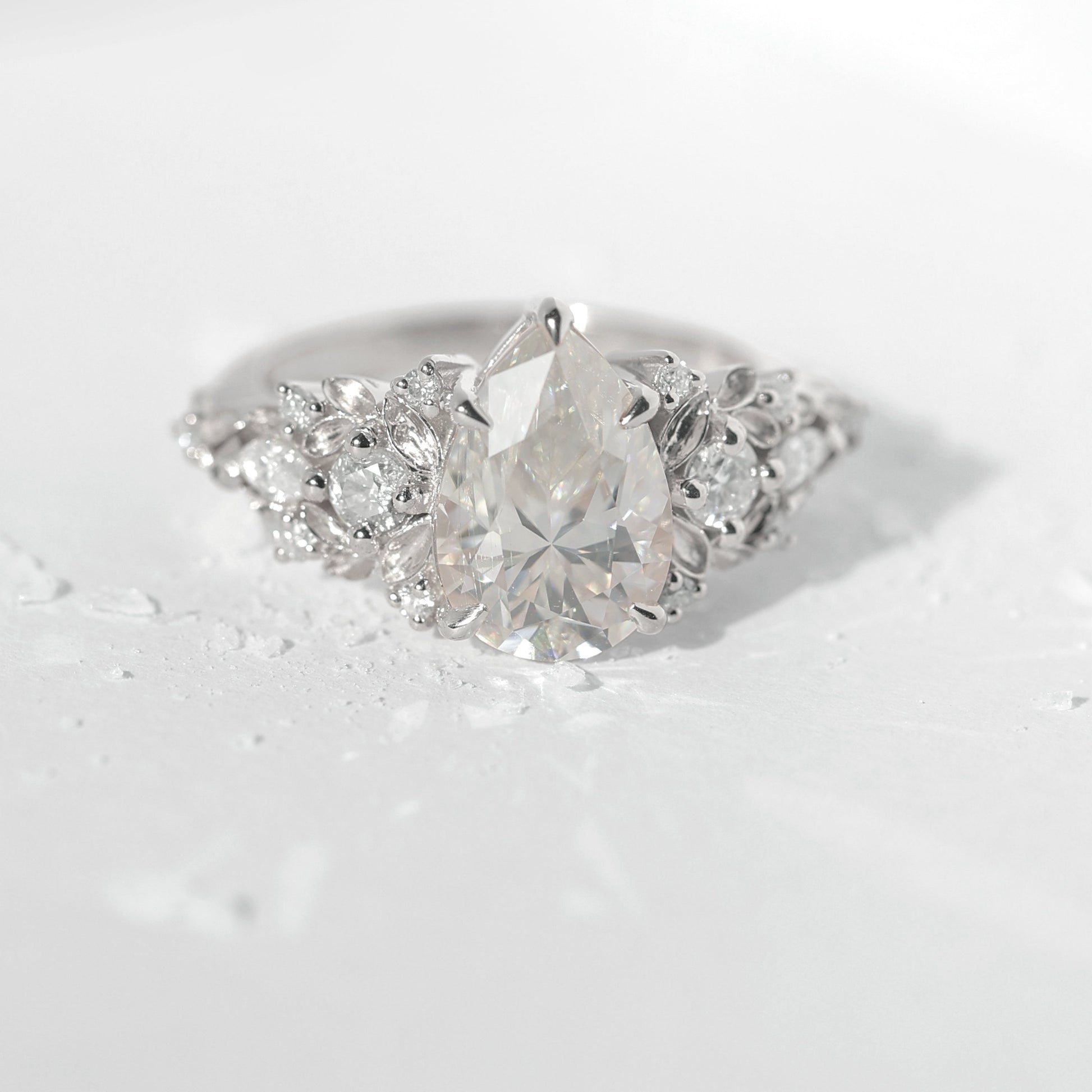 Jedinstveni verenički prsten sa safirom sa približno 3 ct pear laboratorijski uzgojenim dijamantom, uokviren nežnim detaljima nadahnutim listovima i bočnim dijamantima.