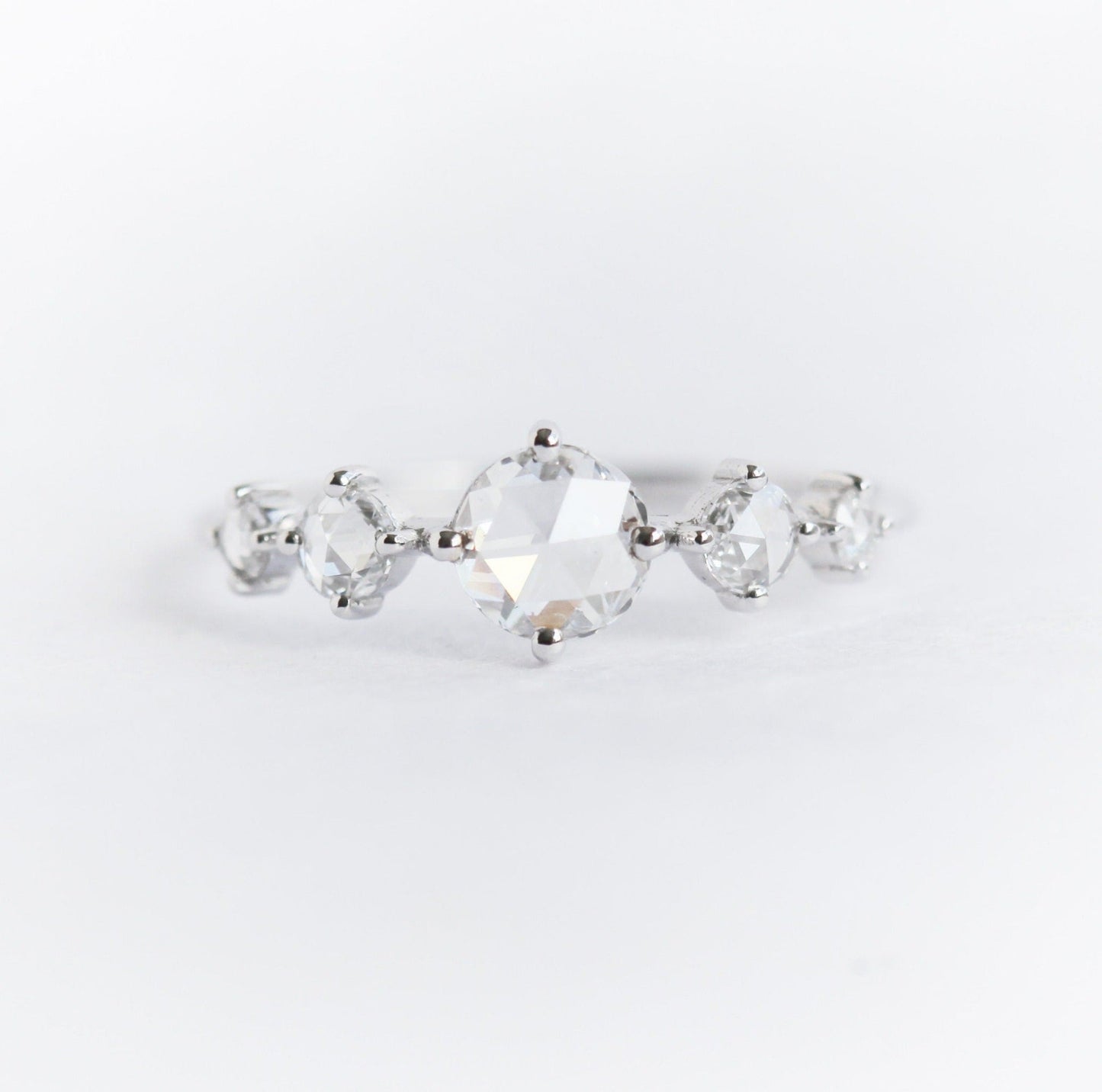Delikatan verenički prsten sa pet okruglih dijamanata. Fini zupci nežno drže kamenje, ističući čistu, minimalističku eleganciju.