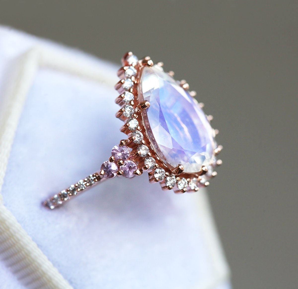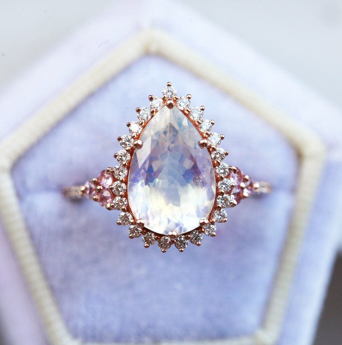 Prelep pear mesečev kamen okružen dijamantima i roze safirima. Ovaj prsten očaraće svaku posebnu damu.