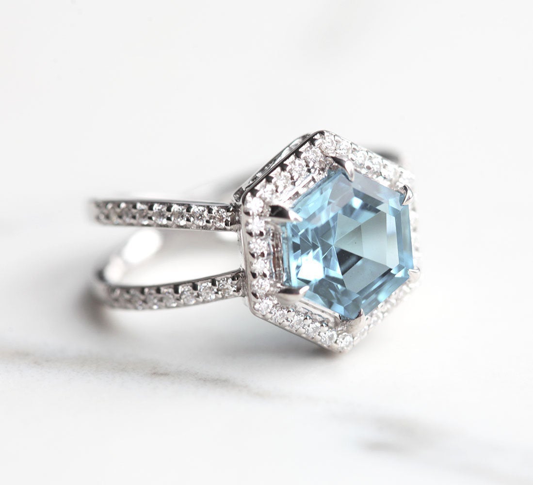 Ambrosia, elegantan verenički prsten koji će uzdići lepotu vaše dame. Prikazuje akvamarin u hexagon obliku okružen dijamantskim pave detaljima. Moderan i luksuzan izbor za vaš poseban dan.