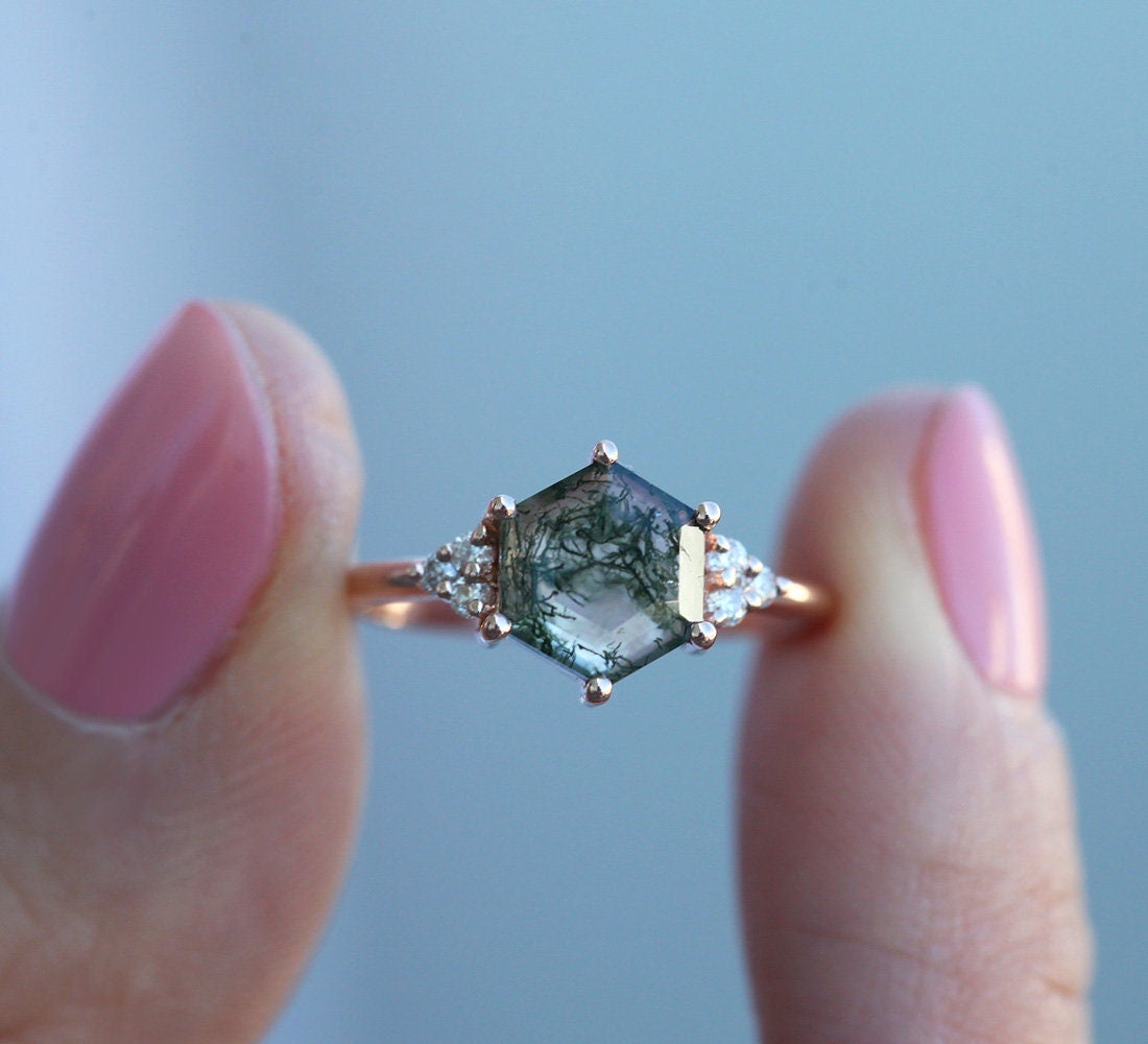 KLARA HEKSAGON MOSS AGATE PRSTEN SET SA DIJAMANTIMA