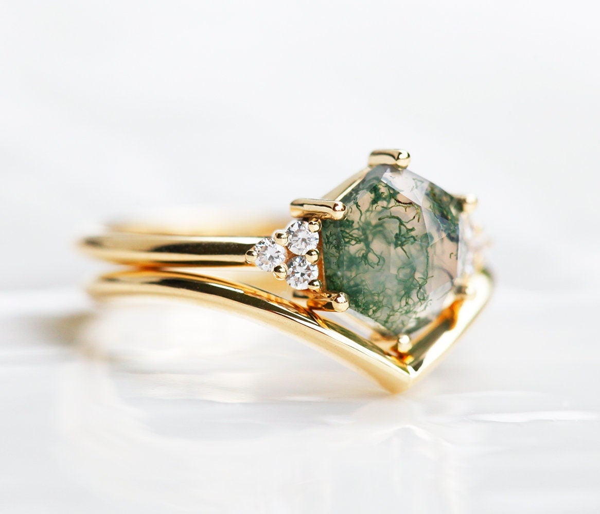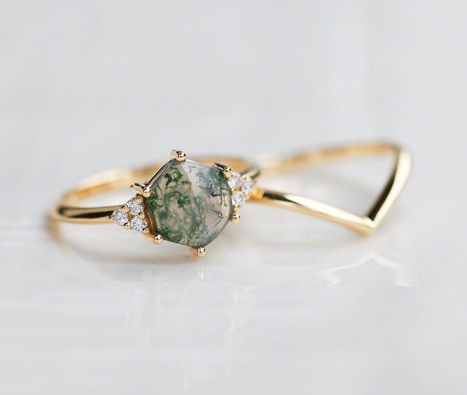 Klara, naš prsten sa moss agate kamenom sa heksagon ili oktagon oblikom zelenog kamena i sa bočnim okruglim brilliant cut belim dijamantima, uparen sa chevron uklapajućim prstenom. Jedinstveni geometrijski set za modernu damu.