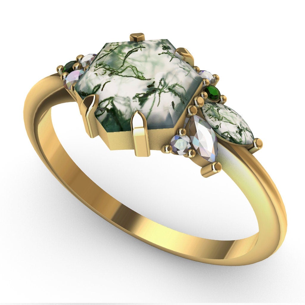 GRACE PRSTEN SA MOSS AGATE-OM U OBLIKU HEKSAGONA I BOČNIM KAMENČIĆIMA