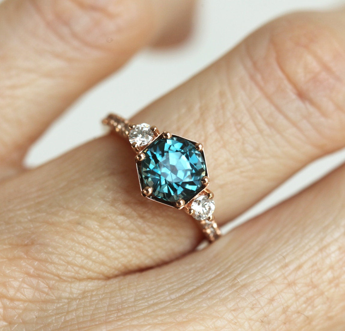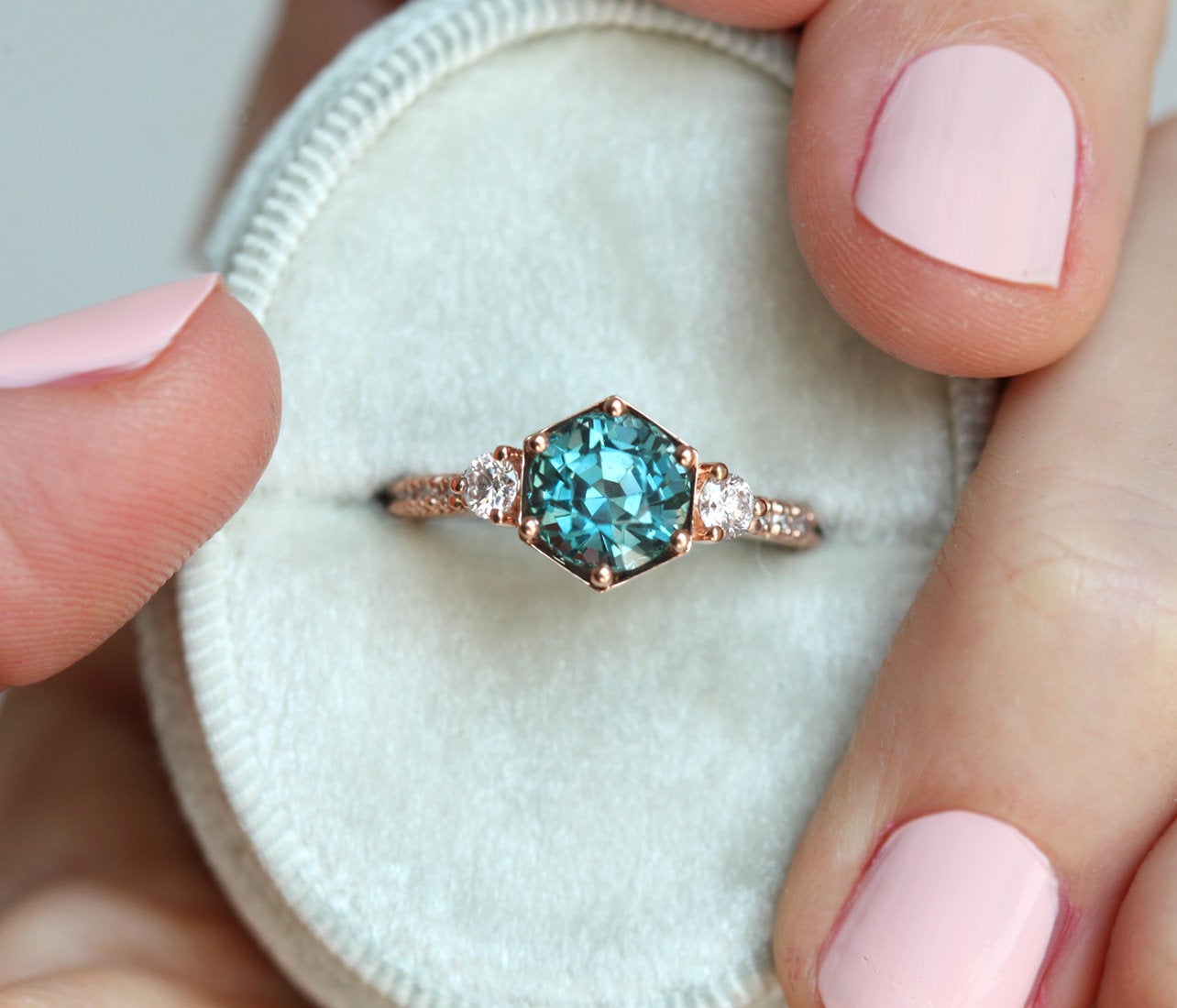 Naš Valentina prsten prikazuje izvanredan heksagonalni dizajn sa 2.2ct plavkasto-zelenim safirom u centru, sa bočnim dijamantima i half pave dijamantskim prstenom. Kao što ime sugeriše, ovo je savršen verenički prsten za Dan zaljubljenih ili zapanjujuće lep poklon.