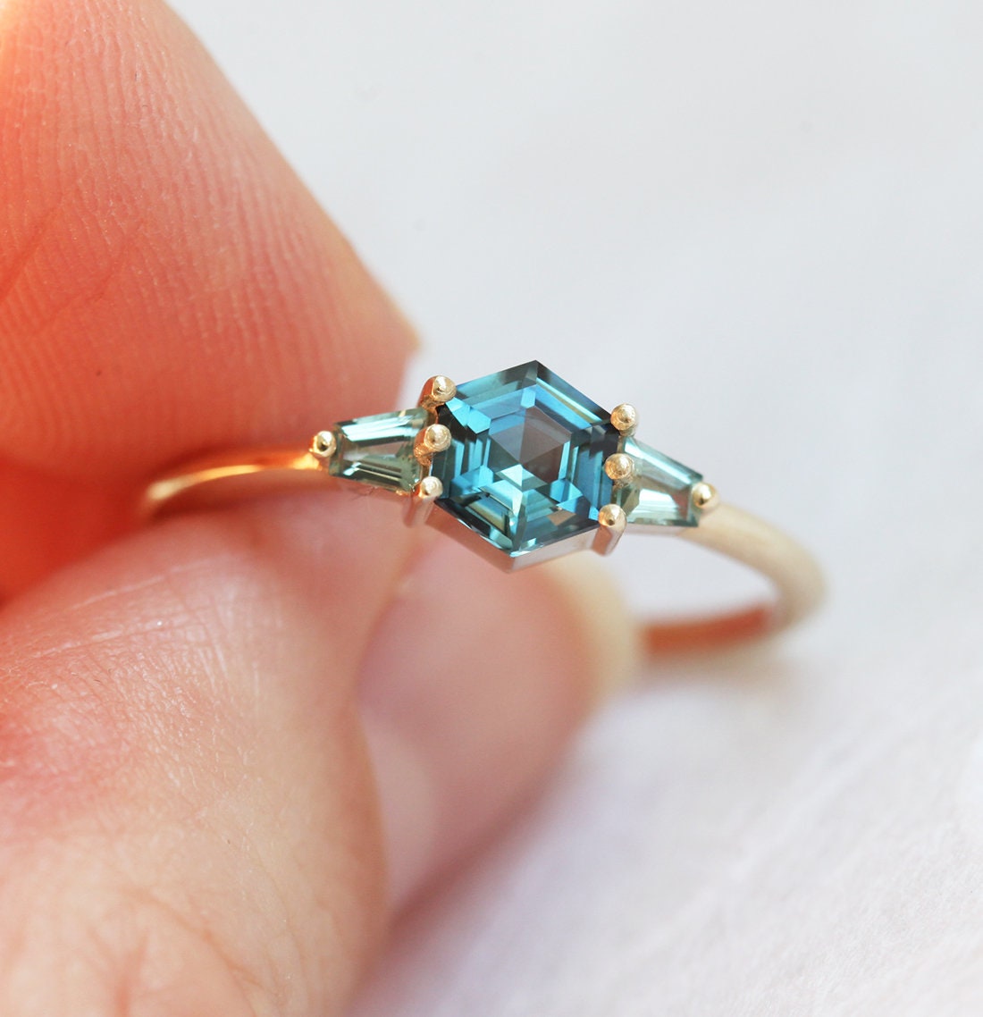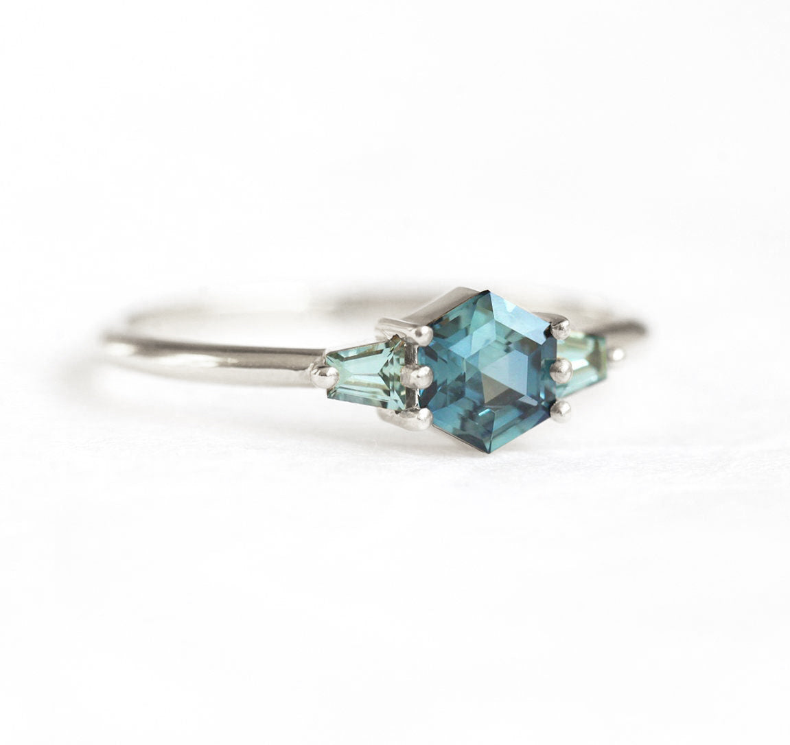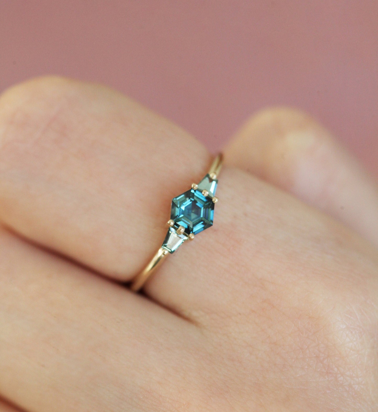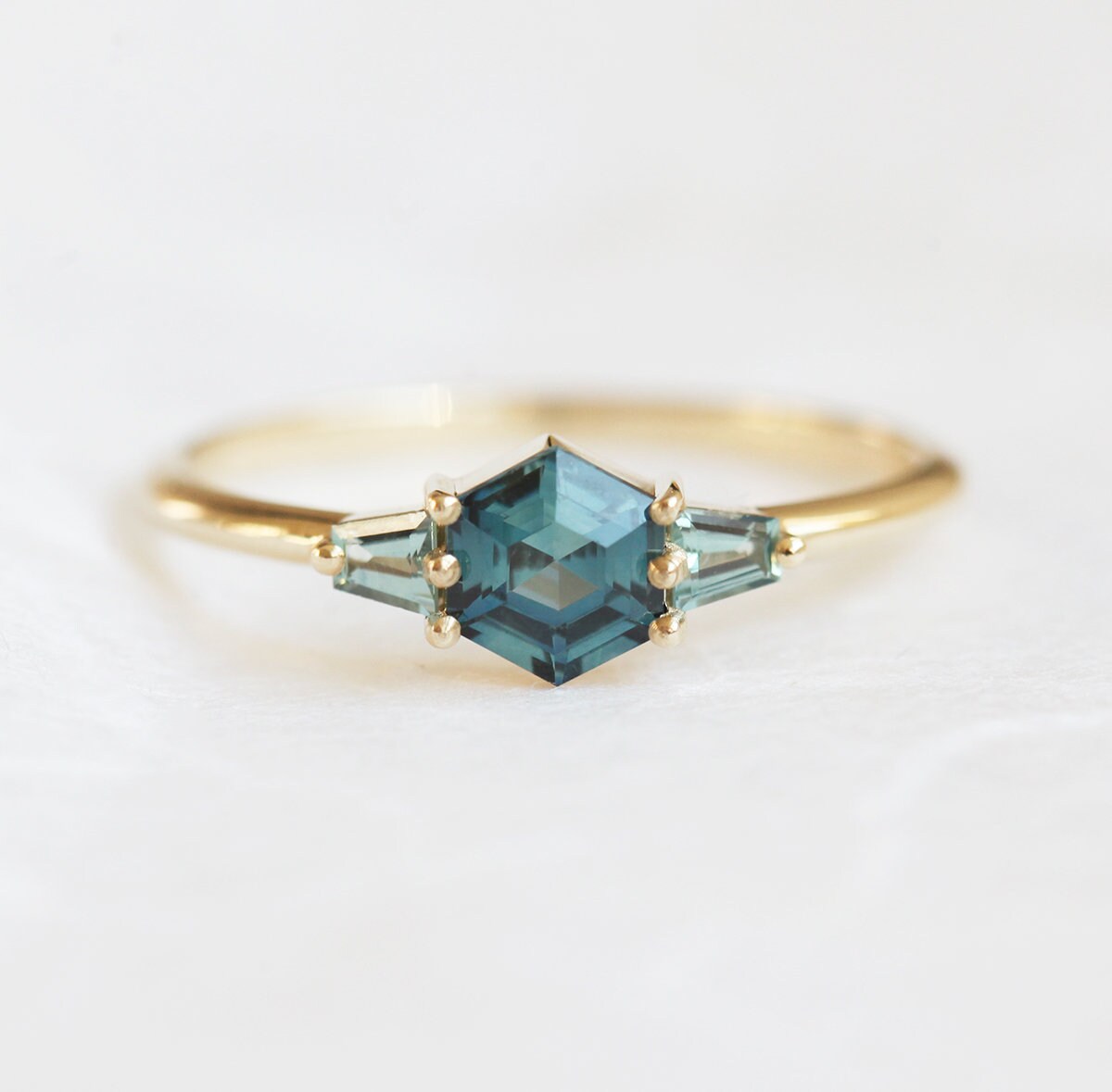 Sarah – sofisticiran prsten sa heksagonalnim teal safirom, namenjen dami koja voli luksuzne i elegantne dizajne.