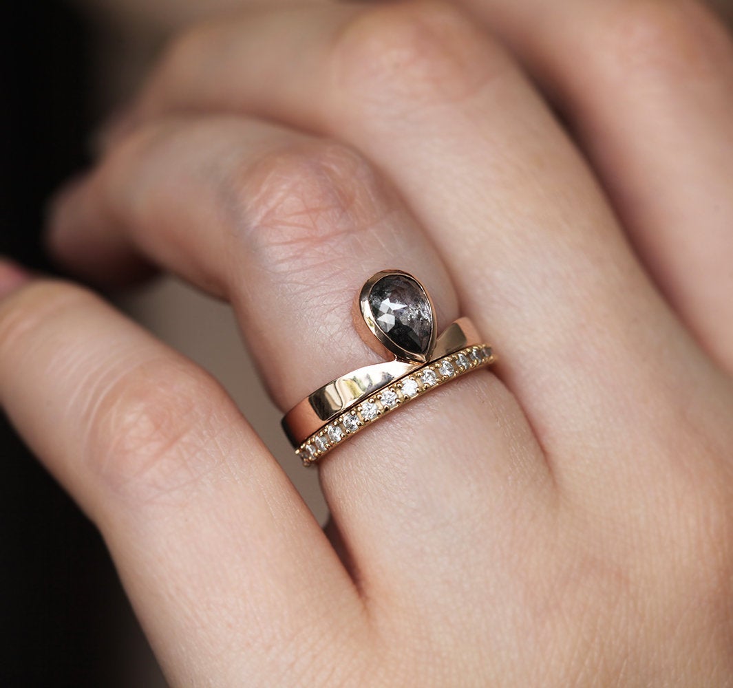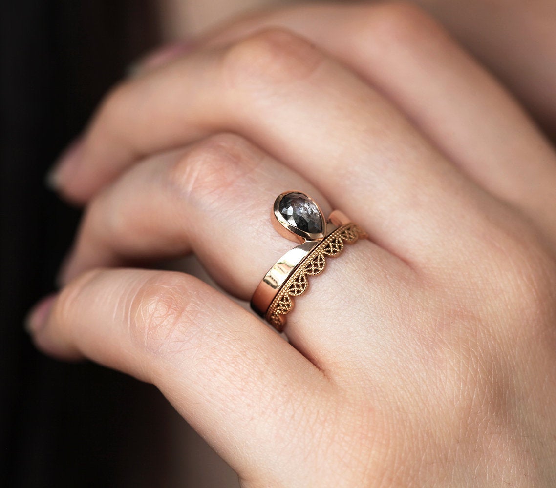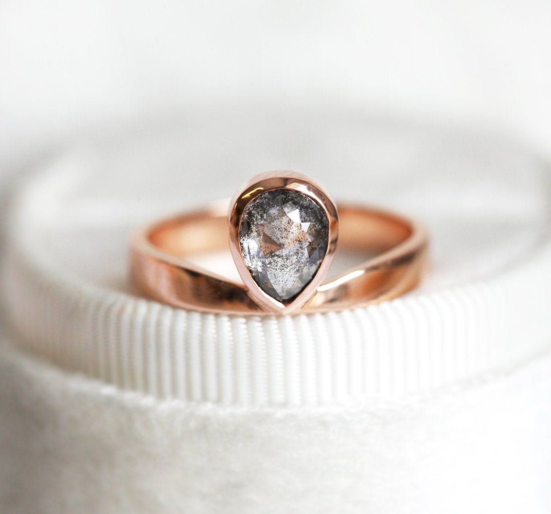 Estelle prsten odiše kraljevskim šarmom - sadrži 1-karatni "salt and pepper" dijamant u elegantnoj postavci od roze zlata. Savršen prsten za kraljicu vašeg srca.