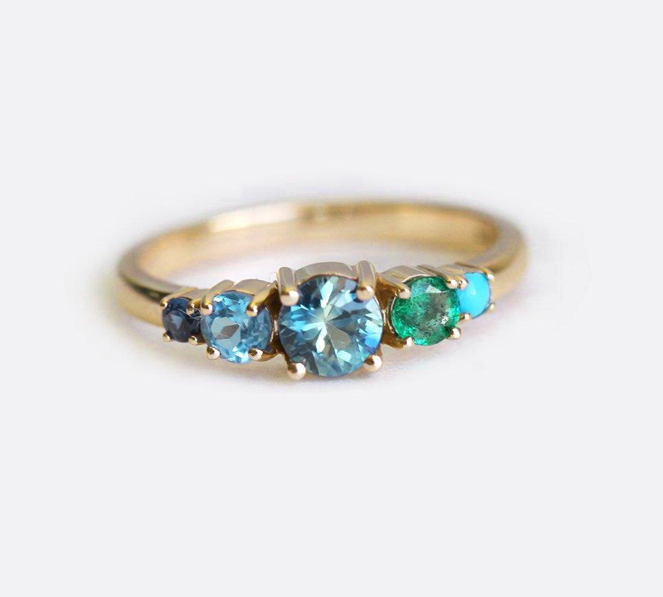 Ženstven i jedinstven, Jan je verenički prsten sa klasterom od pet dragih kamenja - dva safira, smaragda, topaza i tirkiza. Stvorite večne uspomene sa ovim posebnim komadom nakita.