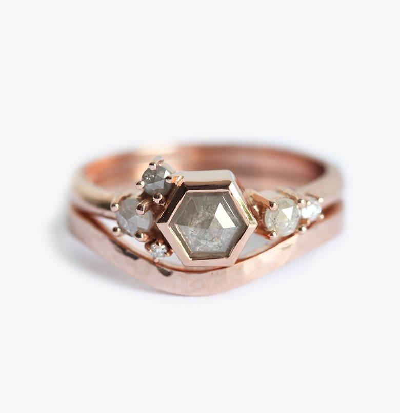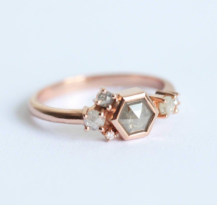 Ovaj prelepo izrađen klaster dijamantski prsten sadrži jedinstveni heksagonalno sečen sivi dijamant sa bočnim roze i brilijantno sečenim dijamantima. Oživite sve vaše značajne uspomene sa ovim jedinstvenim setom prstenova.