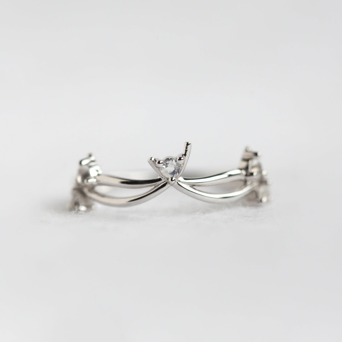 Romantičan. Nežan. Sanjiv. To su reči koje opisuju lepotu ovog prstena. Uvijeni oblik sa pet mesečevih kamenčića od 2mm dodaje dodatnu romantičnu notu vašem glavnom prstenu. SPREMAN ZA SLANJE