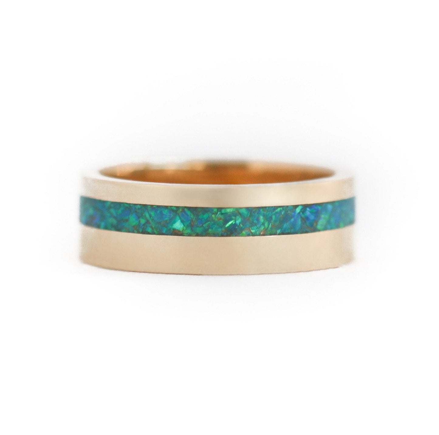 Jedinstveni i stilizovani muški prsten od drobljenog opala, napravljen da se uklopi sa crnim opal prstenom vašeg partnera. Ovaj dizajn je elegantan način da dodate dašak iridescencije vašoj svakodnevnoj nošnji.