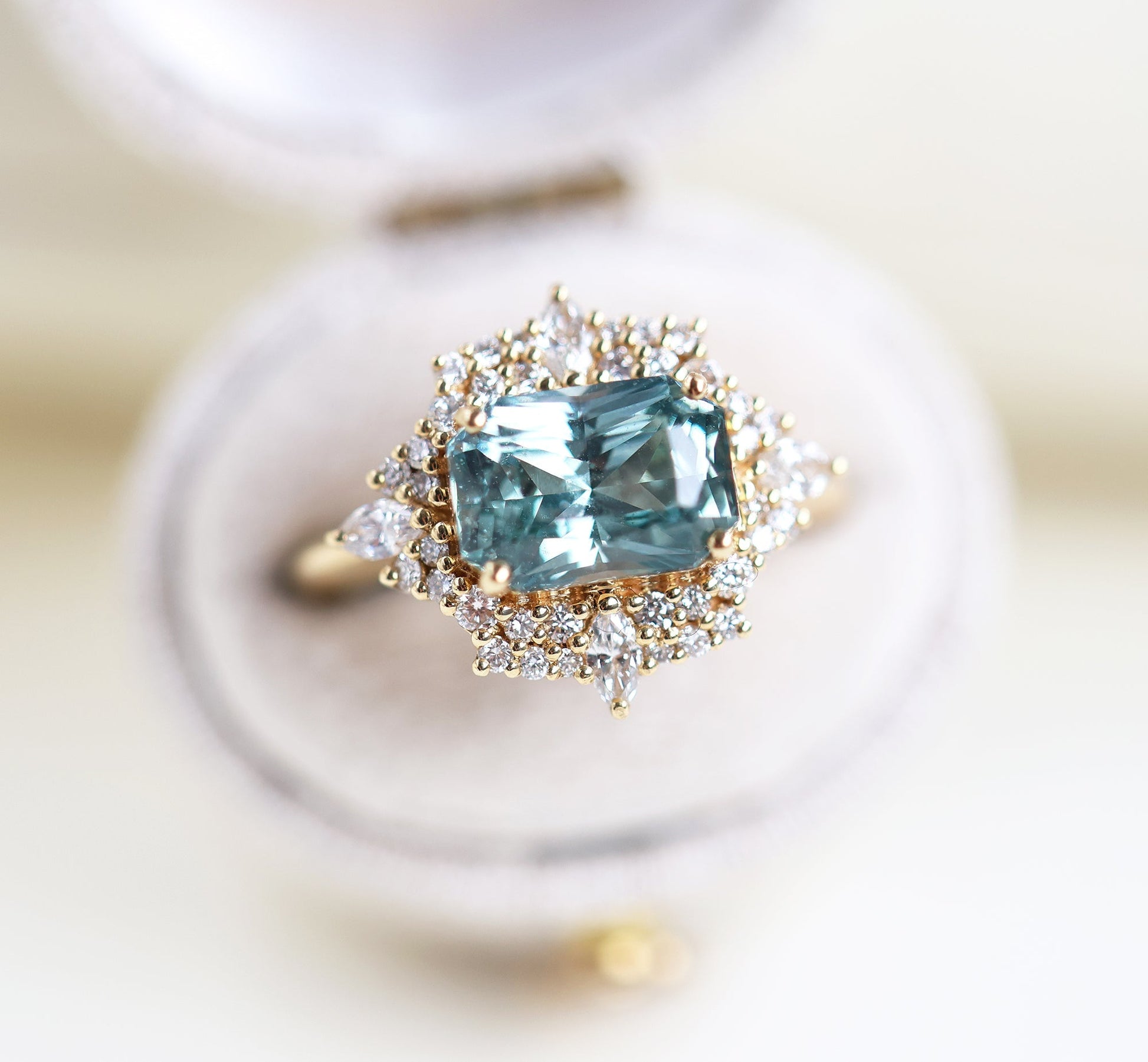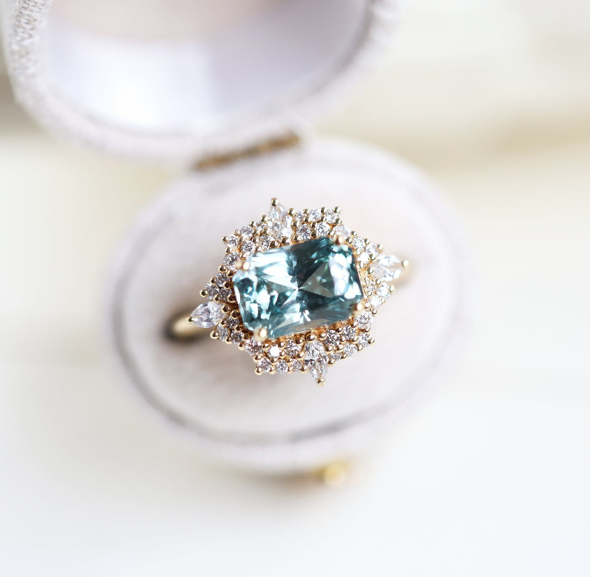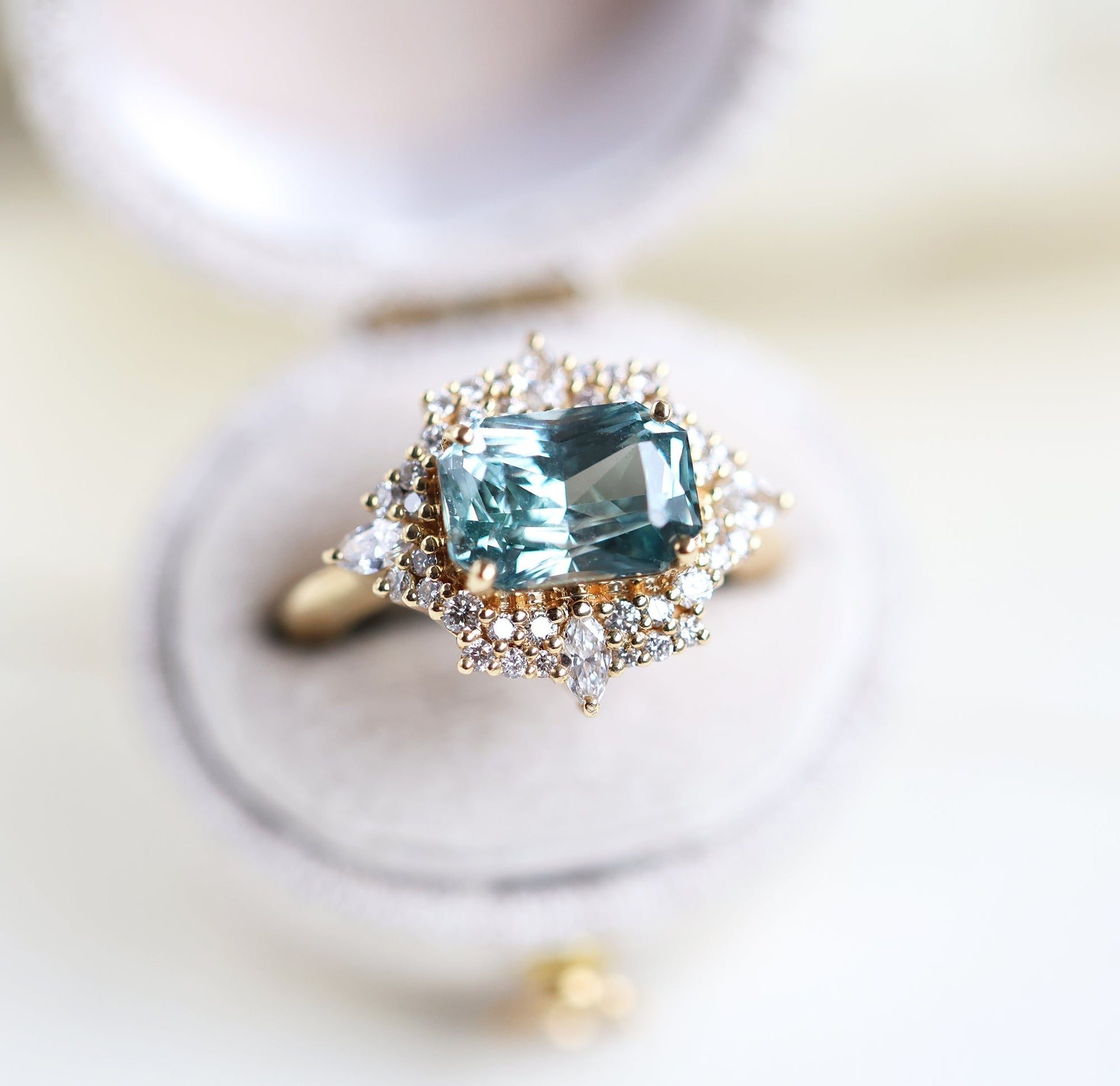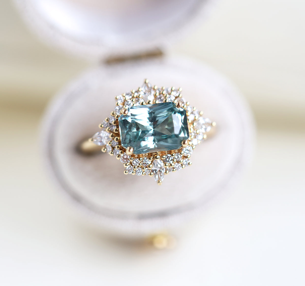 Mint safirov dijamantski prsten sa halo dijamantima