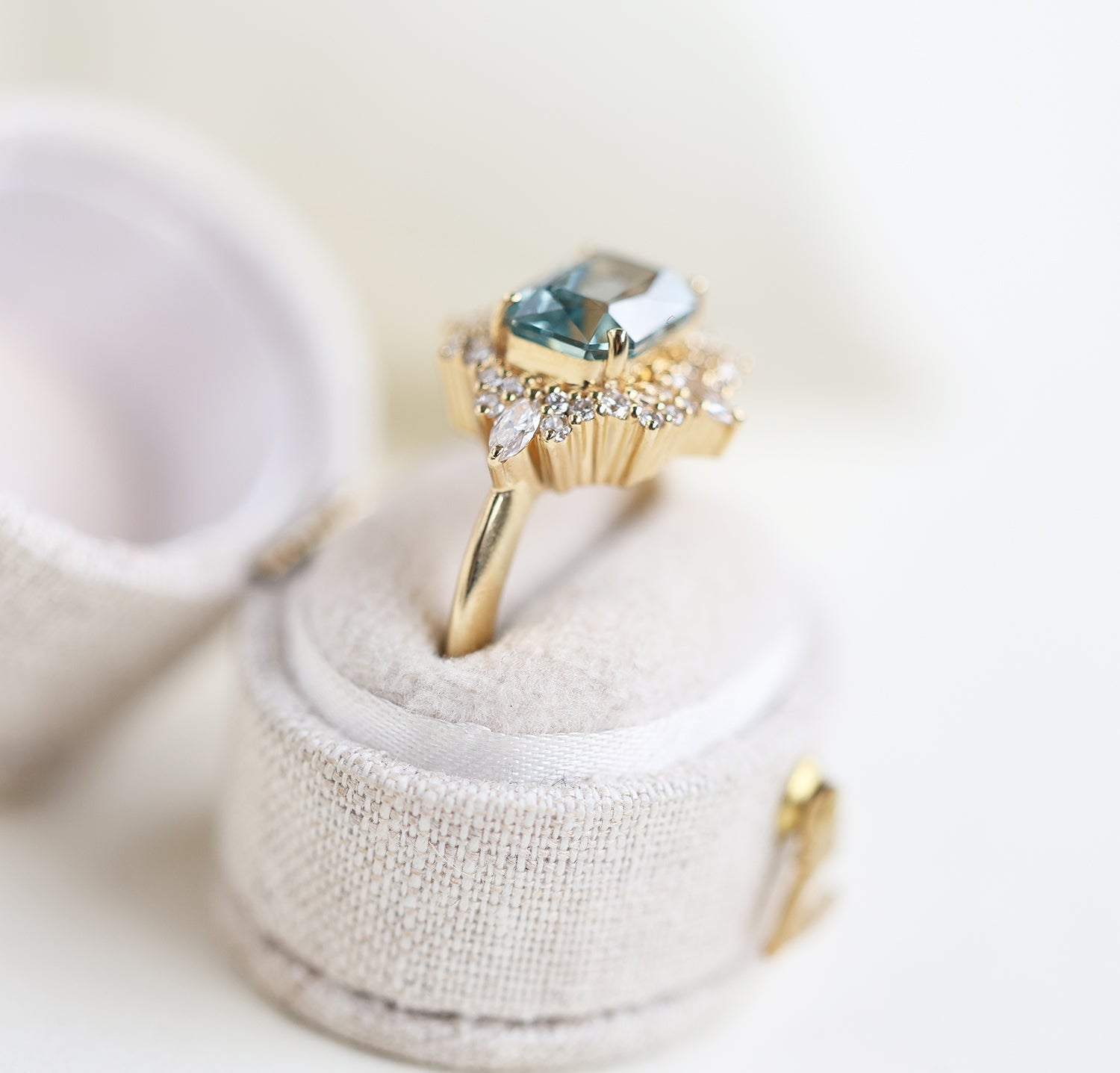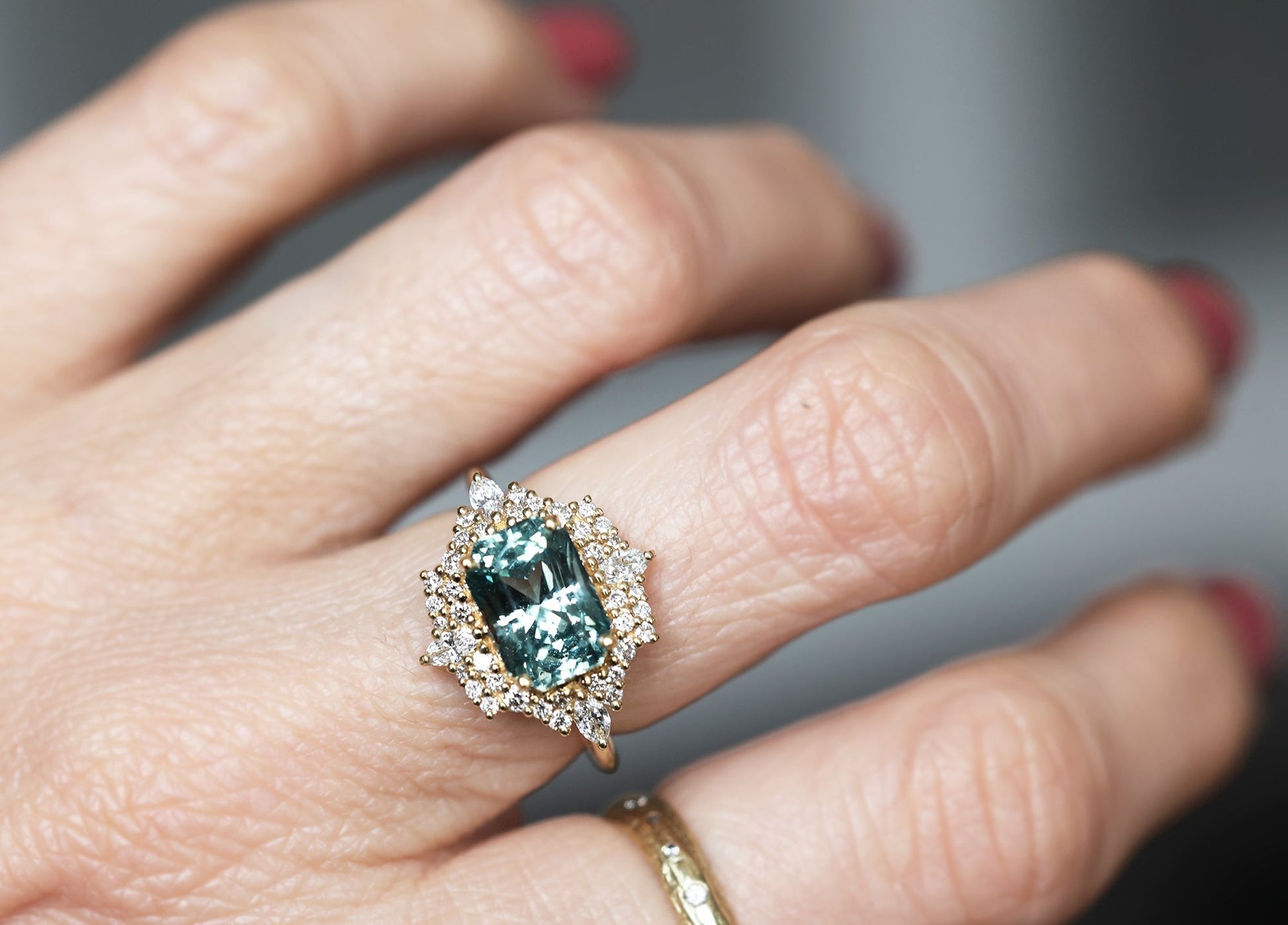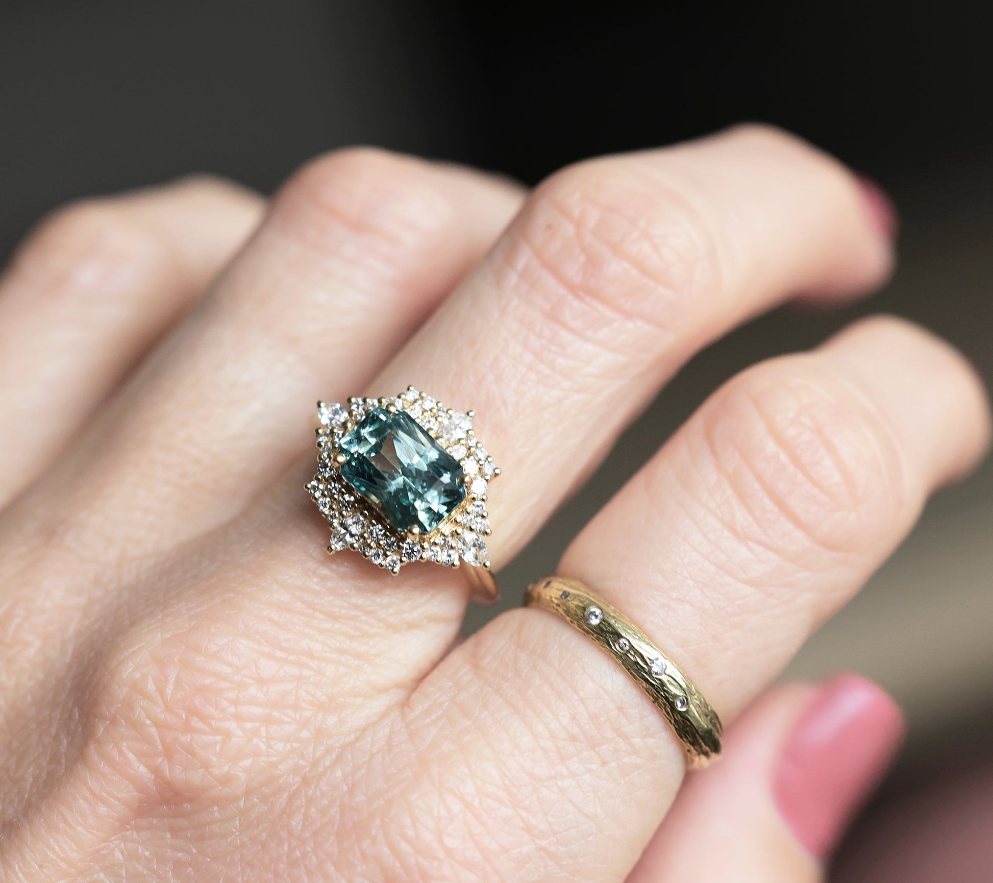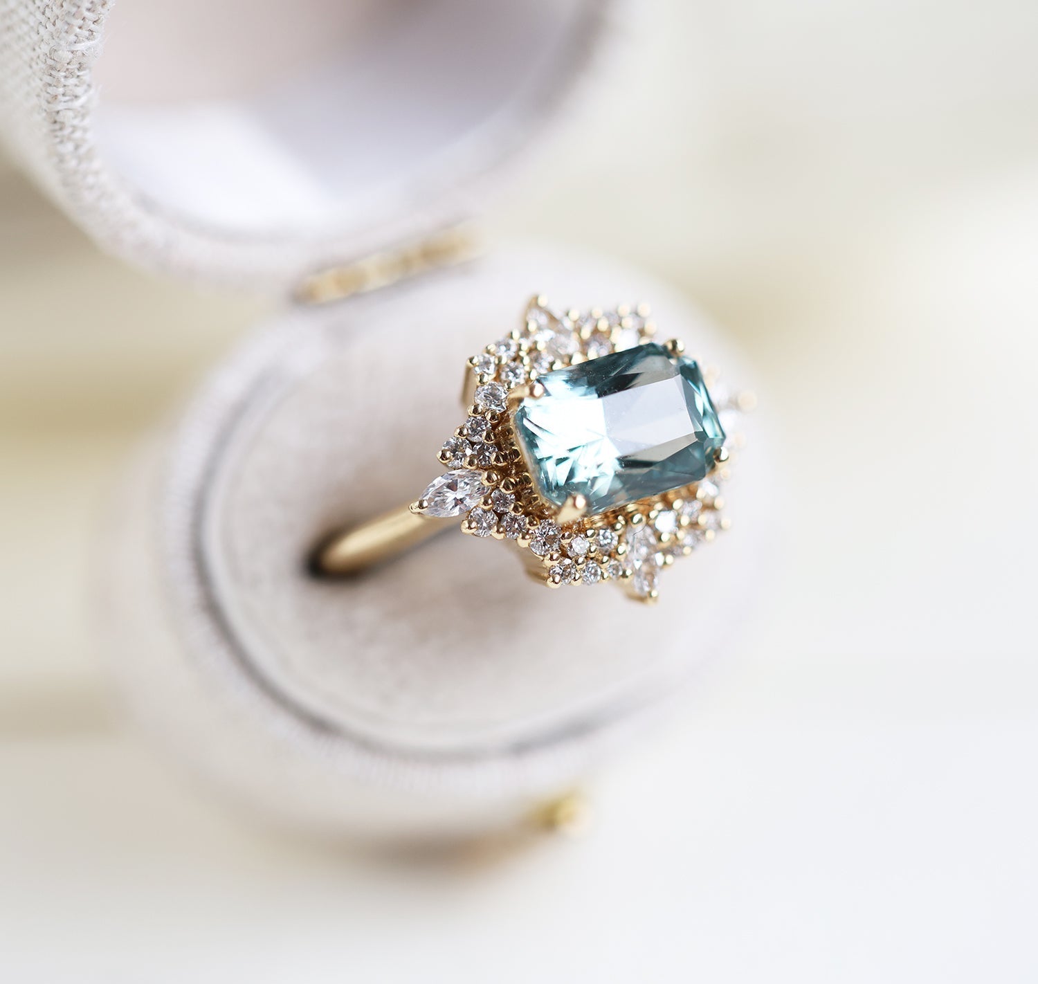 Mint safirov dijamantski prsten sa halo dijamantima