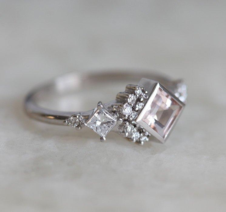 Dozvolite da vas očara naš klaster prsten sa princess cut morganitom i dijamantima. Ovaj luksuzni komad sadrži morganit u bezel postavci, okružen grupom većih dijamanata, koji zrače vanvremenskom elegancijom i sofisticiranošću.