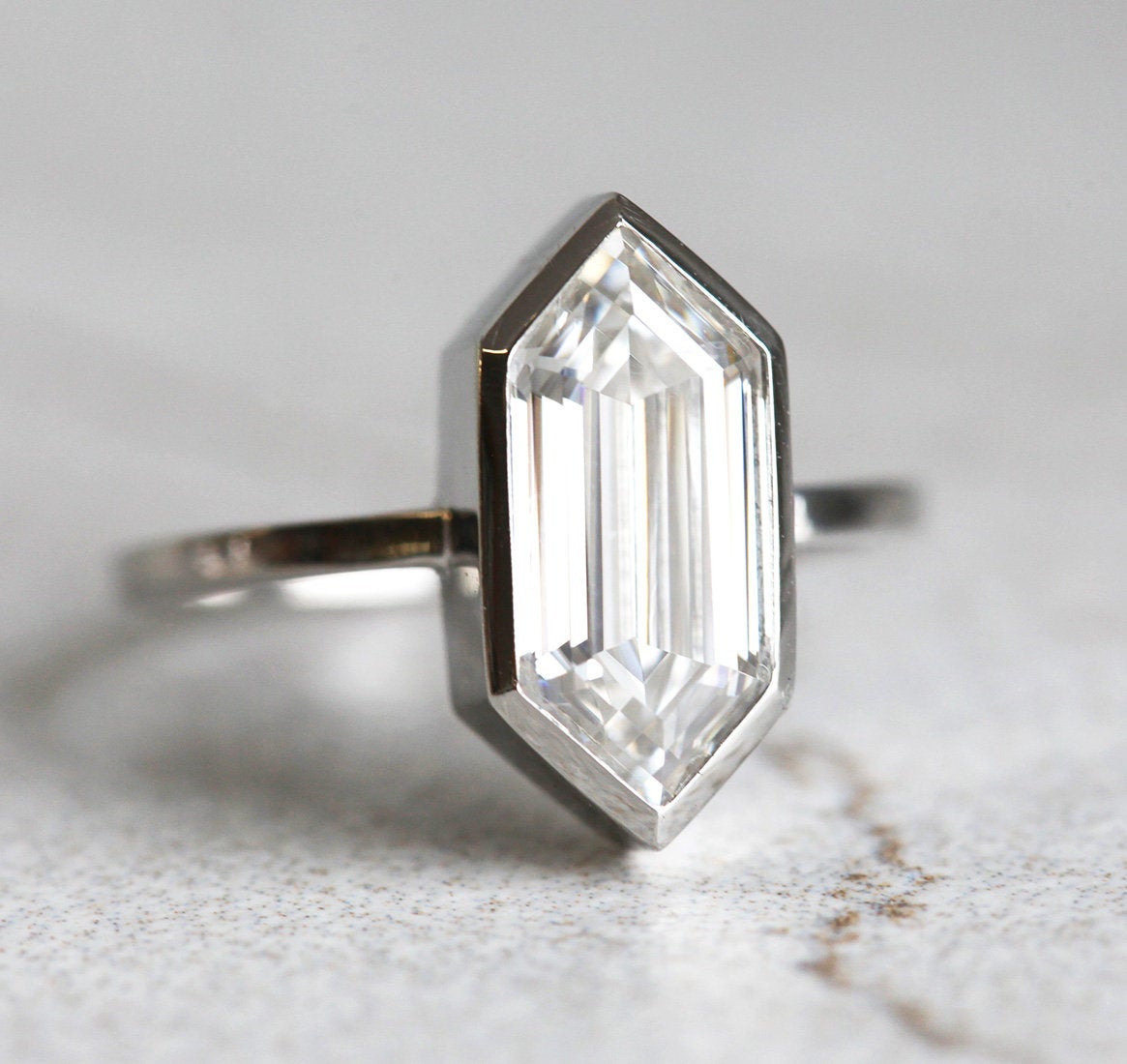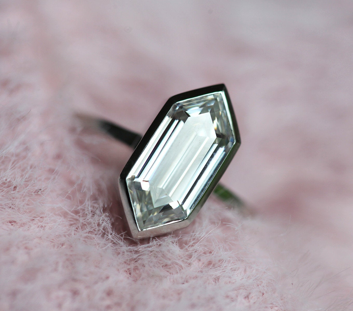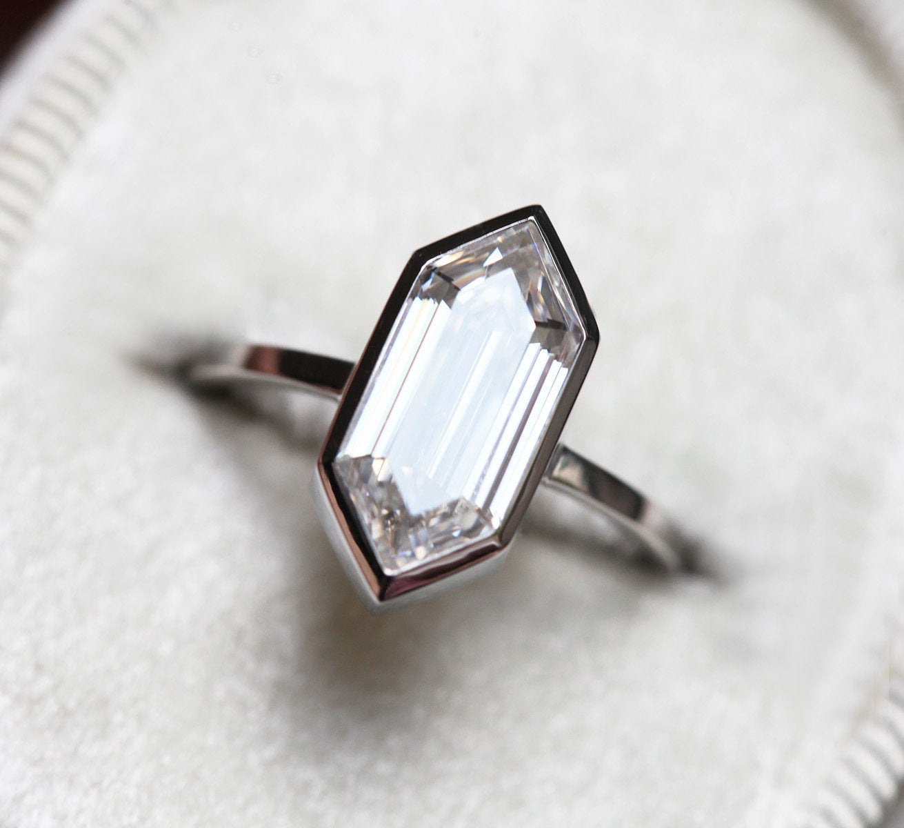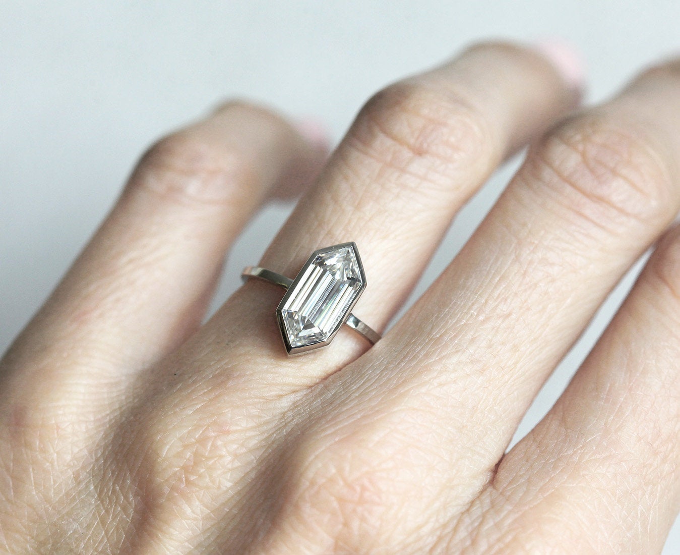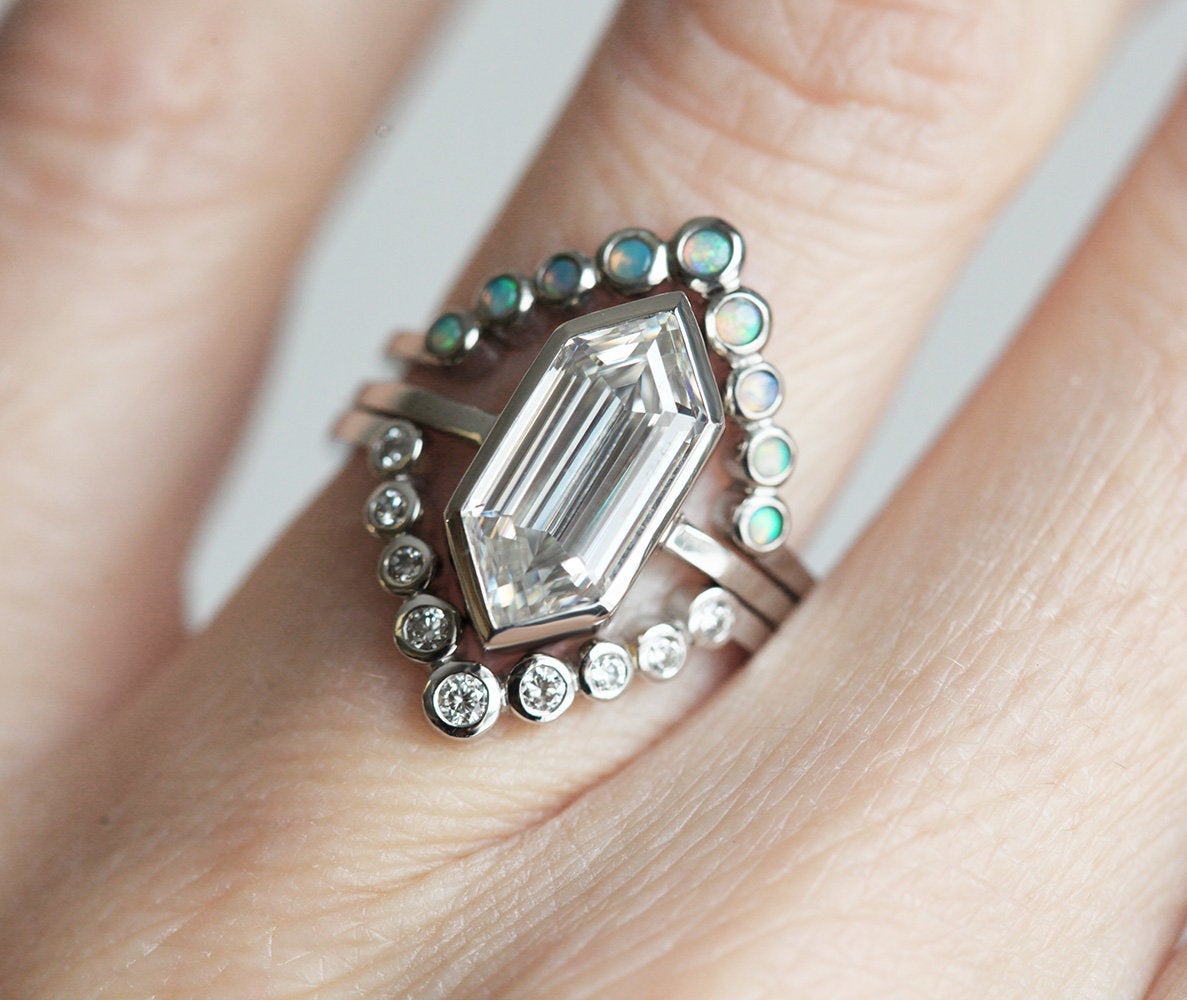 Moderan i geometrijski verenički prsten inspirisan Art Deco stilom. Za one koji su zaljubljeni u geometrijske oblike ili jednostavno u moissanite – ili oboje. Asya prsten ima sve. Može se kombinovati sa jednim ili dva uklapajuća prstena kako bi se dodatno istakla lepota njegovog dizajna.