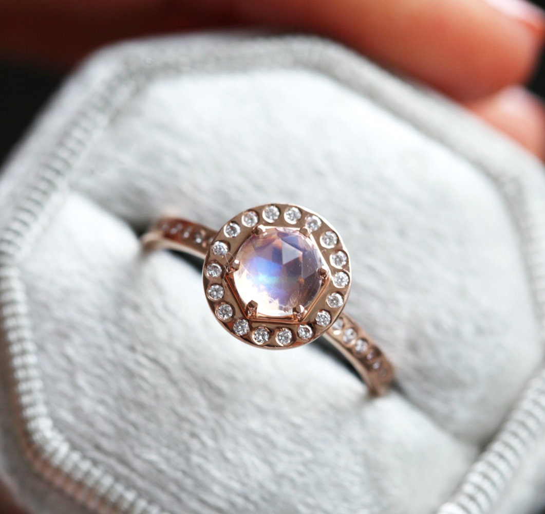 Dijamantski prsten sa Mesečevim kamenom i halo dijamantom